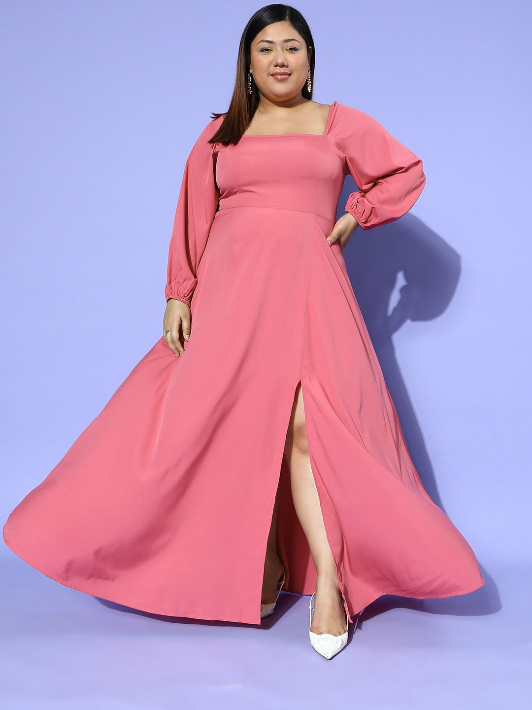 Berrylush Women Plus Size Solid Pink Square Neck Crepe Zipper-Up Thigh-High Slit Fit & Flare Maxi Dress