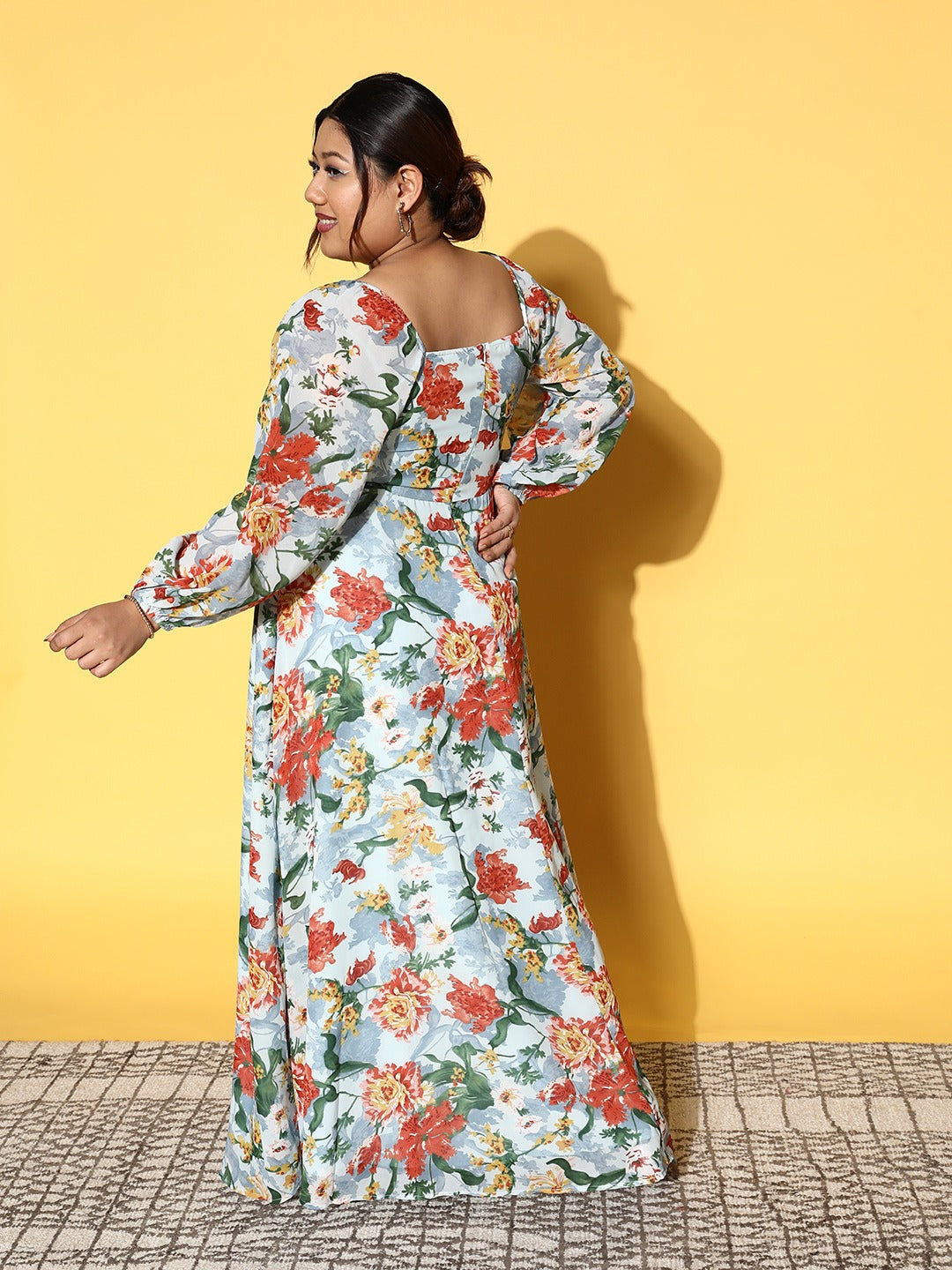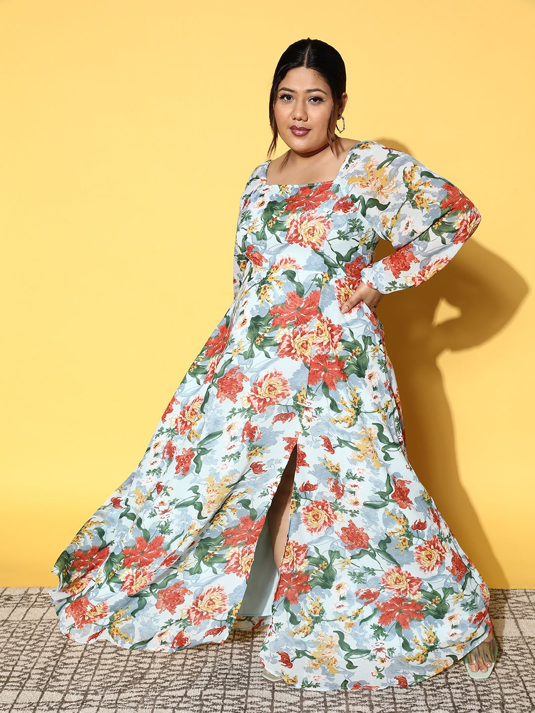 Berrylush Women Plus Size Blue & Orange Floral Printed Square Neck Georgette Thigh-High Slit Flared Maxi Dress