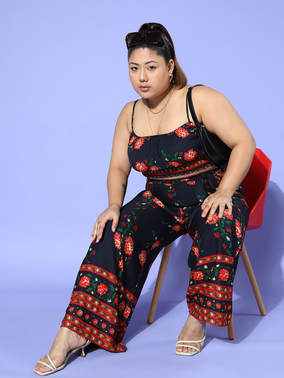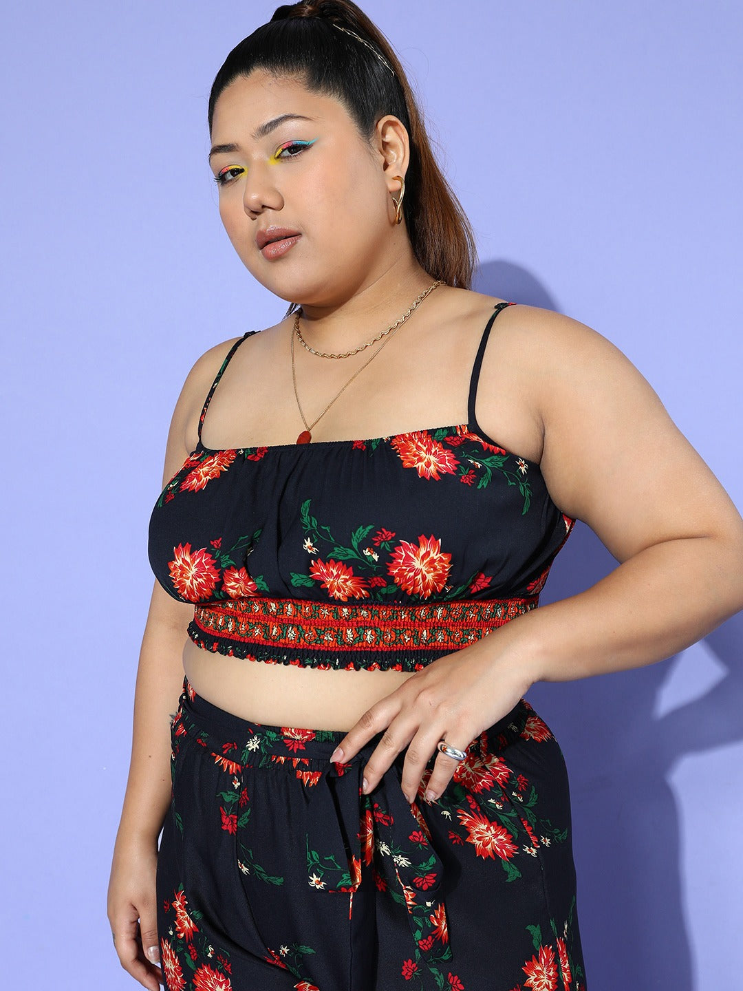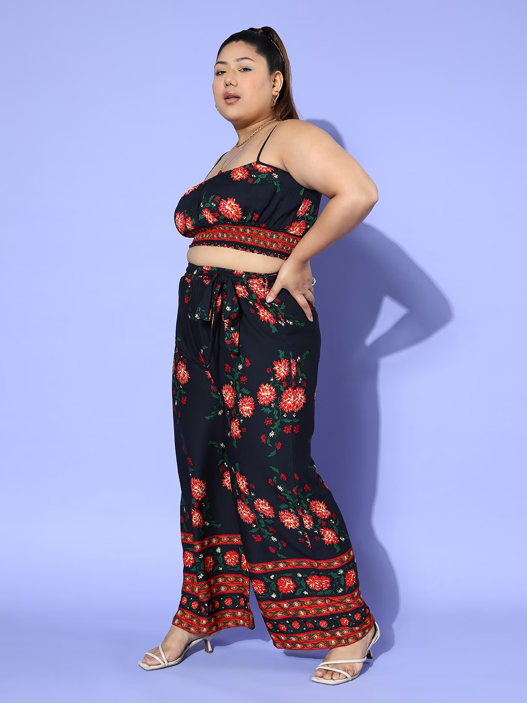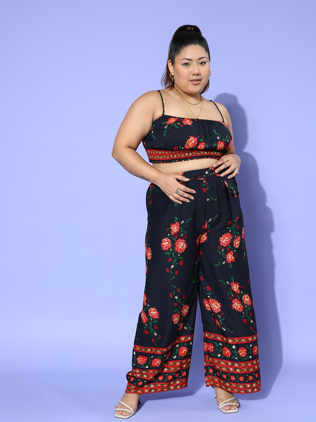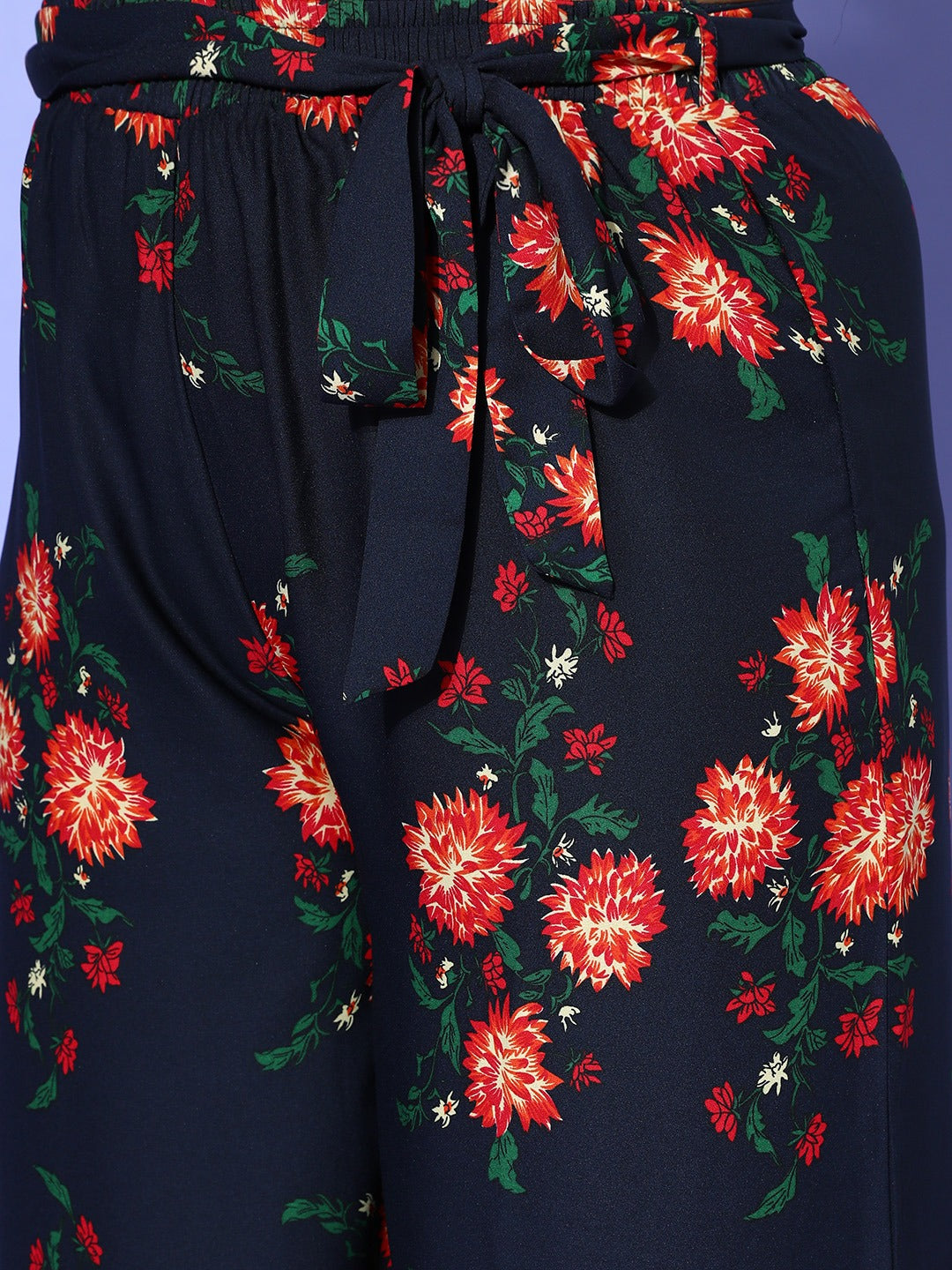 Berrylush Women Plus Size Navy Blue & Orange Floral Printed Square Neck Waist Tie-Up Crop Top & Wide-Leg Trousers Co-Ord Set