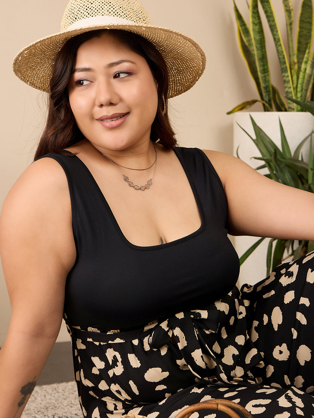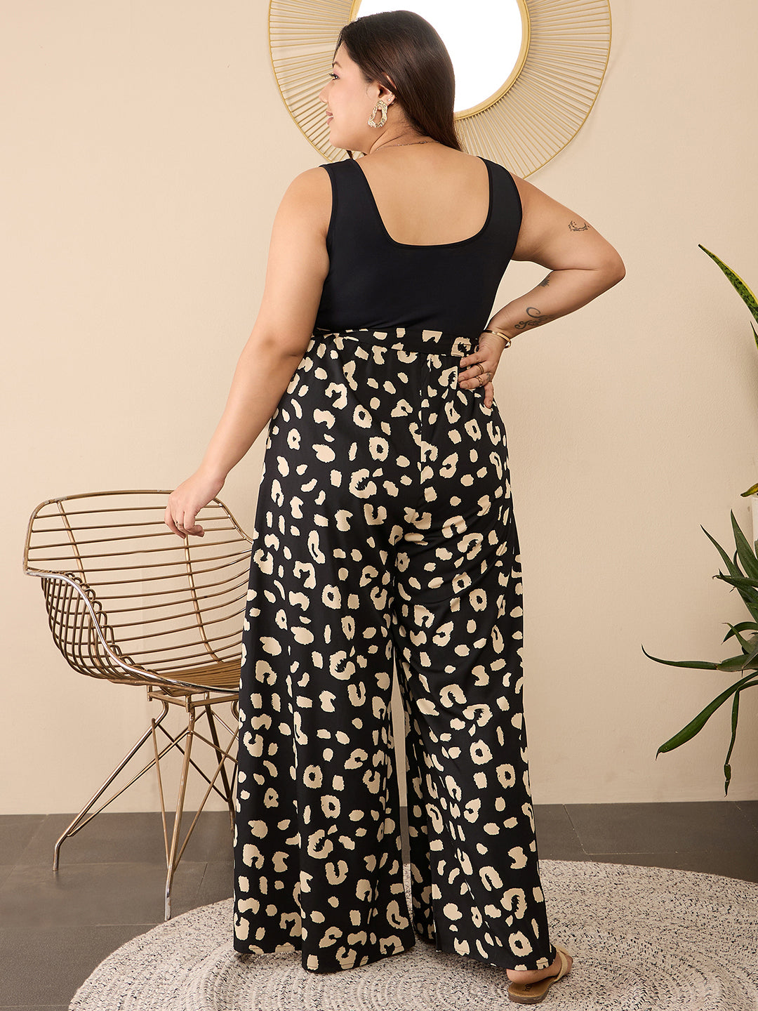 Step into effortless style with the Black & Cream Animal Printed Round Neck Sleeveless Waist Tie-Up Wide Leg Regular Jumpsuit from Berrylush Curve. This striking piece features a chic animal print that adds a trendy touch to your look, perfectly blending boldness with elegance. Crafted from soft polyester, it ensures comfort while you go about your day or enjoy an evening out. The unique round neckline and sleeveless design create a flattering silhouette, while the tie-up waist cinches in for an accentuated shape. With wide-leg pants that flow gracefully as you move, this jumpsuit is designed for those who embrace both fashion and freedom of movement. Opaque coverage means you can wear it confidently on any casual occasion - from brunch dates to relaxed outings with friends - making it a versatile staple in your wardrobe. Slip into this jumpsuit for an effortlessly stylish look every time!