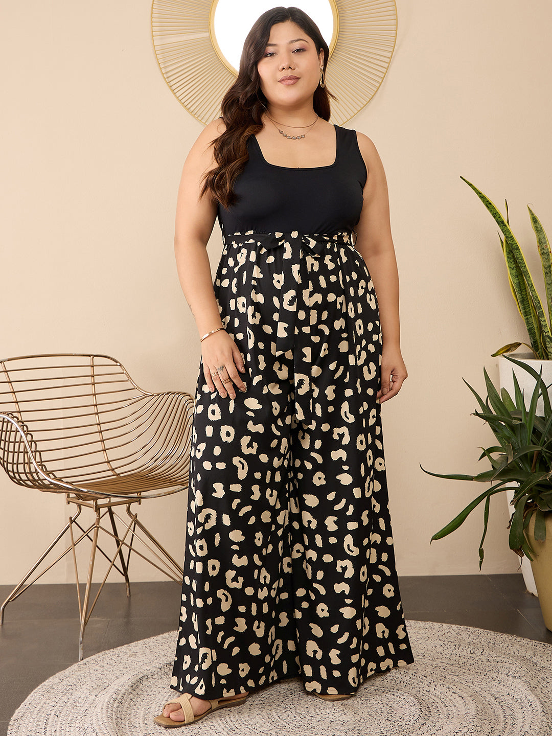 Berrylush Curve Women Black & Cream Animal Printed Round Neck Sleeveless Waist Tie-Up Wide Leg Regular Jumpsuit
