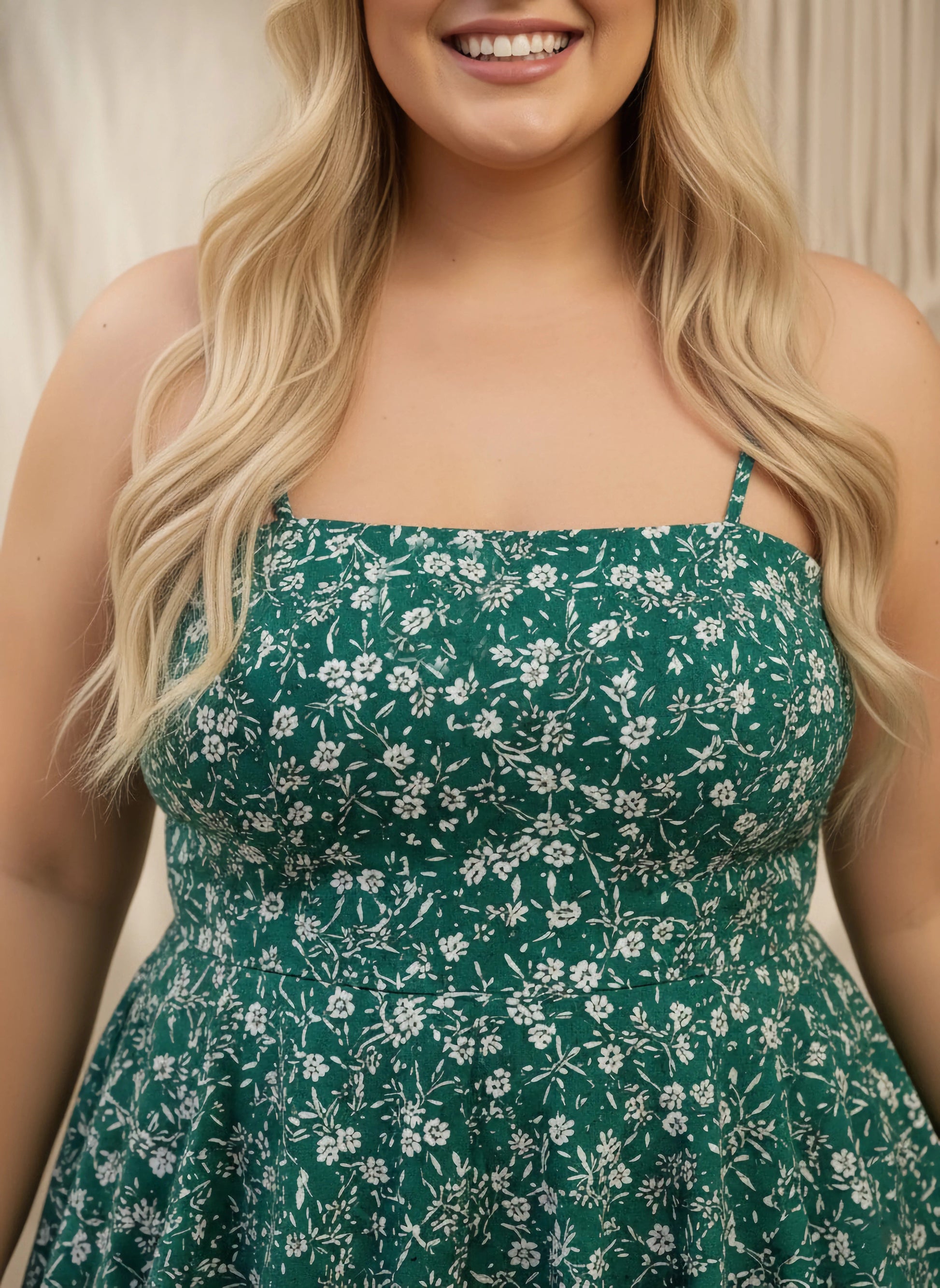 Berrylush Curve Women Green & White Floral Printed V-Neck Sleeveless Back Tie-Up Cutout Layered Mini Jumpsuit