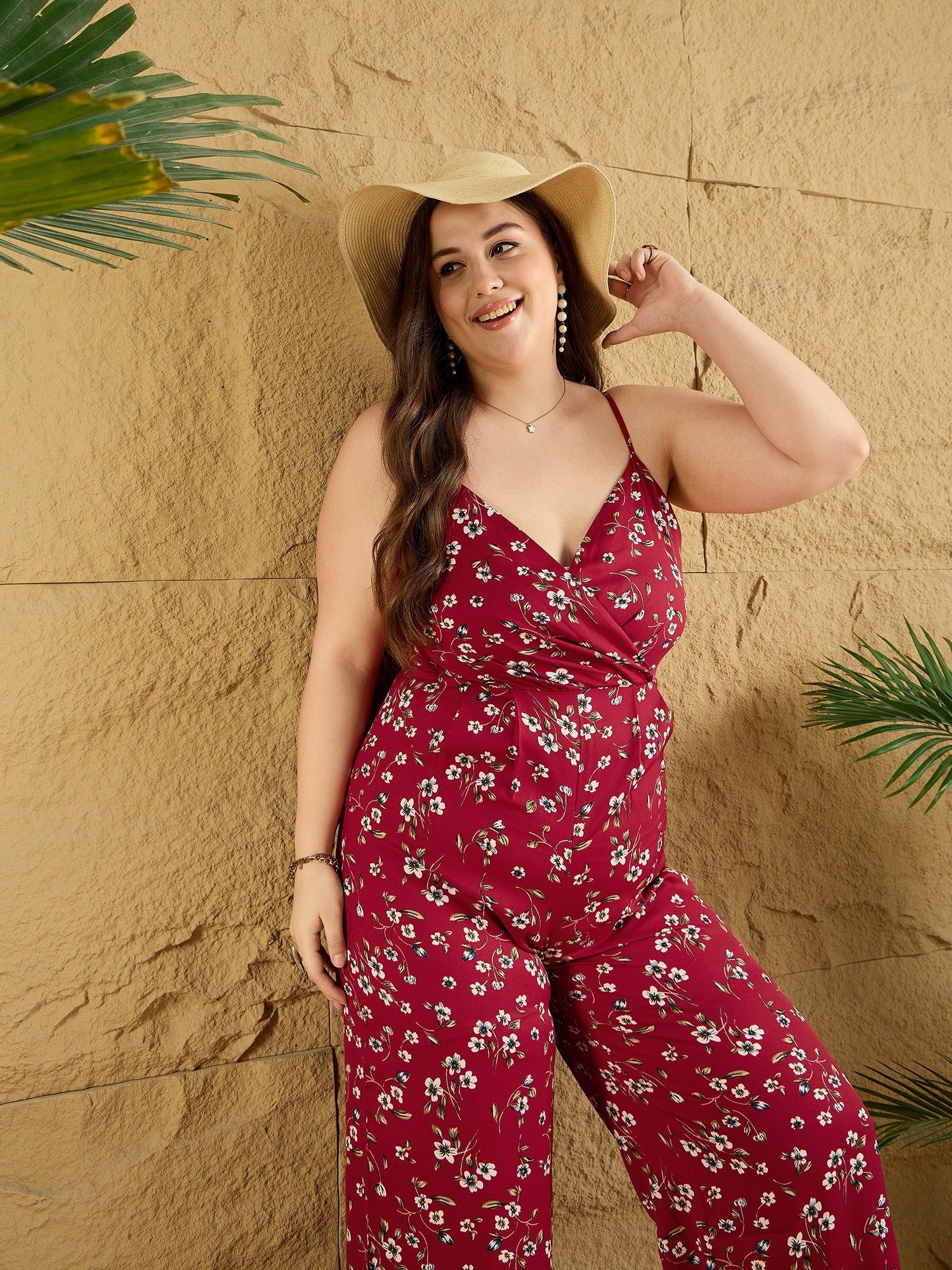 Berrylush Curve Women Red & White Floral Printed V-Neck Sleeveless Back Zipper-Up Straight Hem Wrap Maxi Jumpsuit