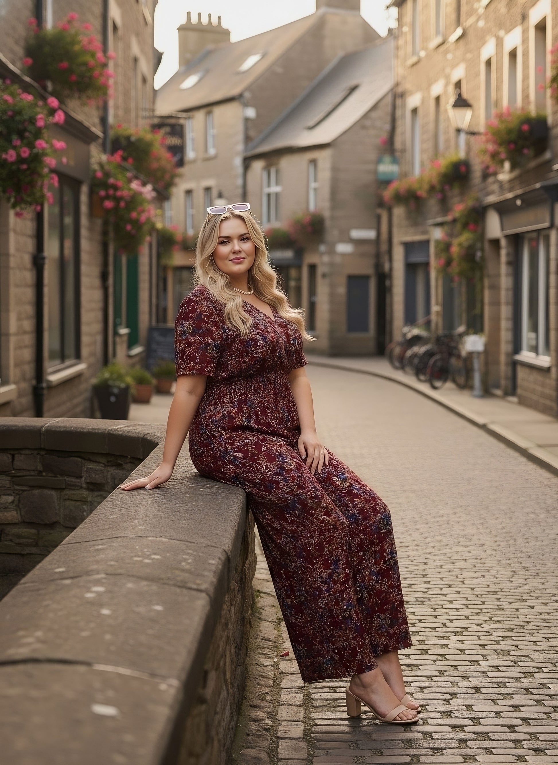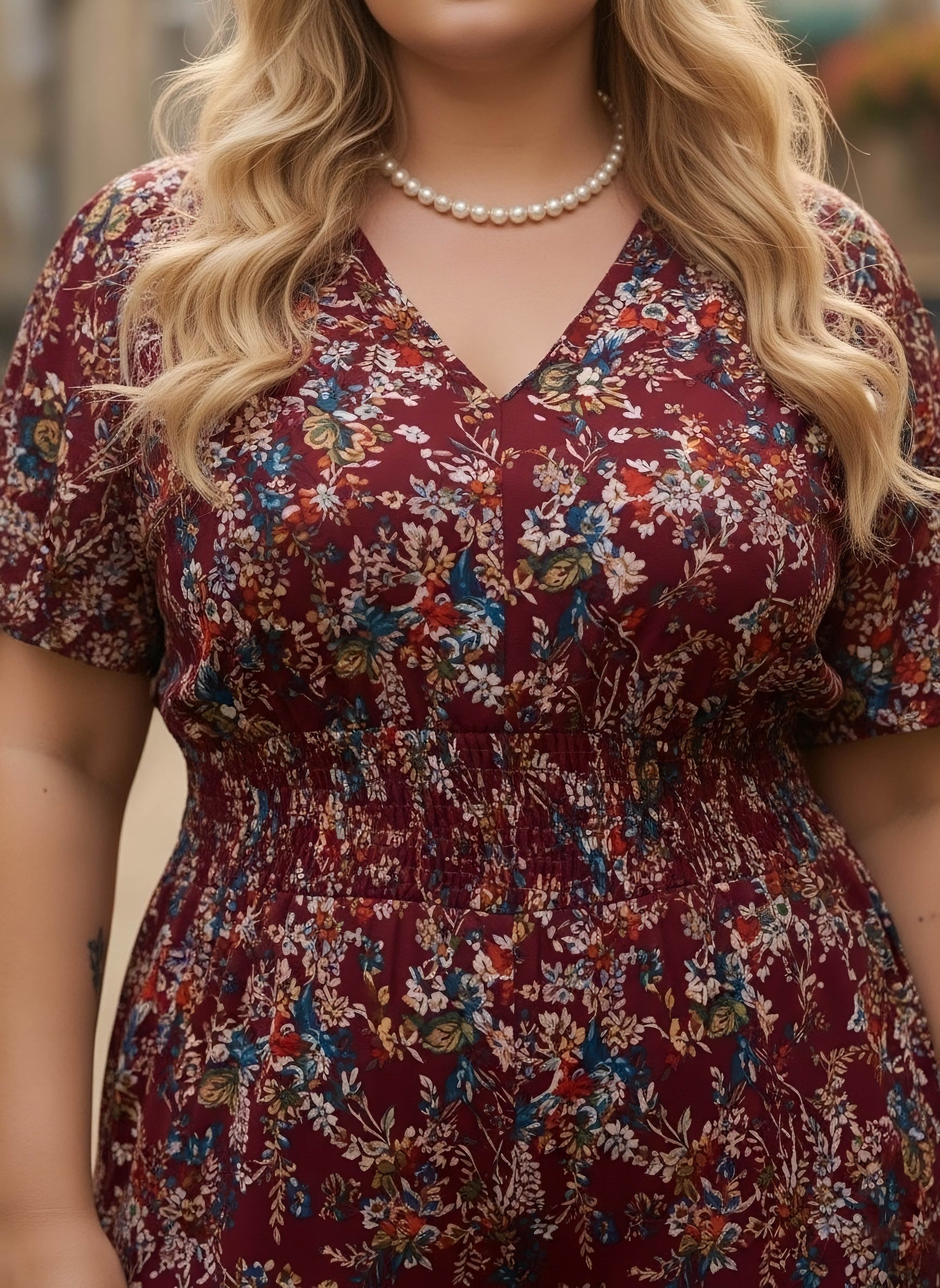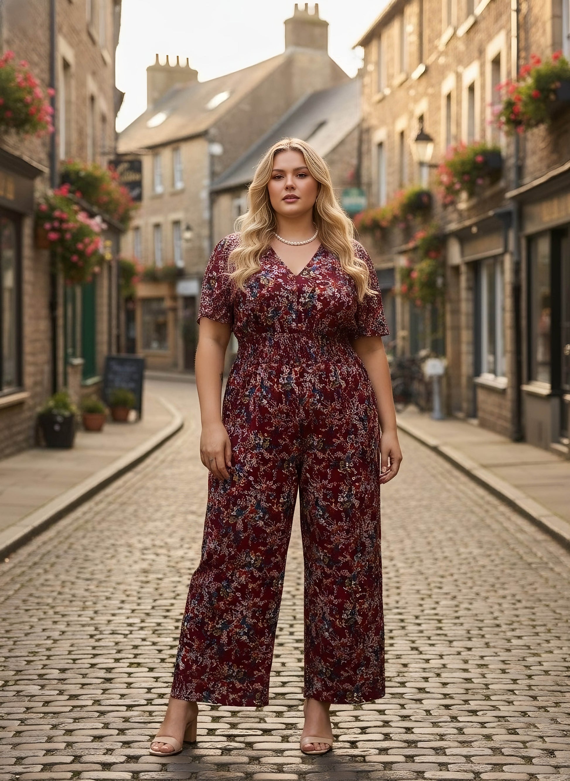 Elevate your travel wardrobe with this stunning Berrylush Curve Maroon & Blue Floral Printed V-Neck Maxi Jumpsuit. The romantic maroon and blue floral print creates an enchanting silhouette, while the smocked detailing ensures both comfort and style. A graceful V-neckline leads to short sleeves, perfect for warm-weather adventures. The woven polyester fabric maintains its shape throughout your journey, offering a flattering, opaque finish. A charming back keyhole with button closure adds a feminine touch to this versatile piece. Whether exploring city streets or enjoying resort dinners, this jumpsuit effortlessly combines sophistication with ease of movement.