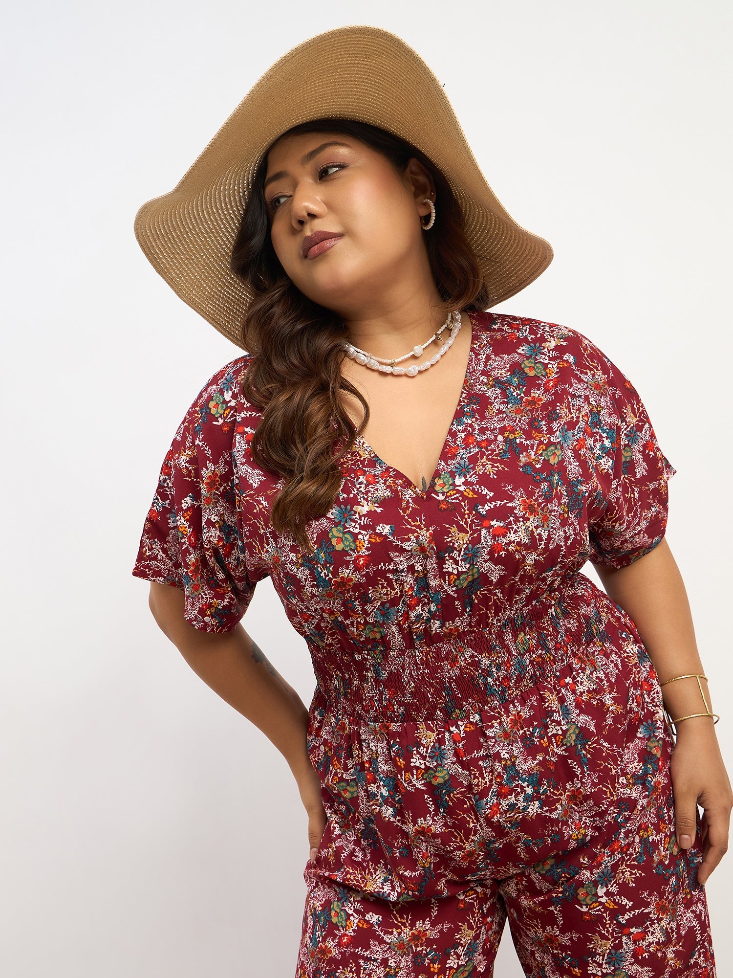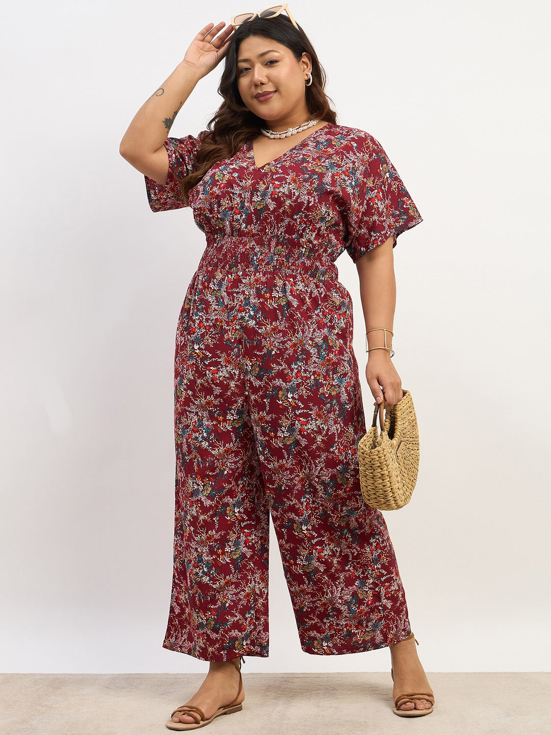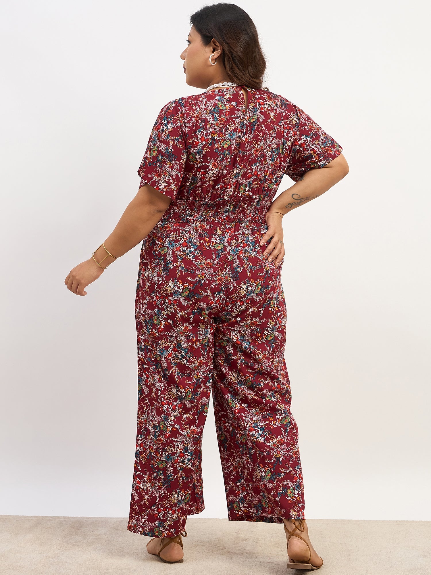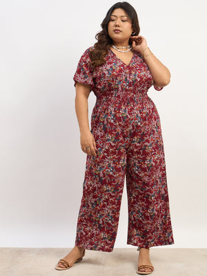 Berrylush Curve Women Maroon & Blue Floral Printed V-Neck Back Keyhole Smocked Maxi Jumpsuit