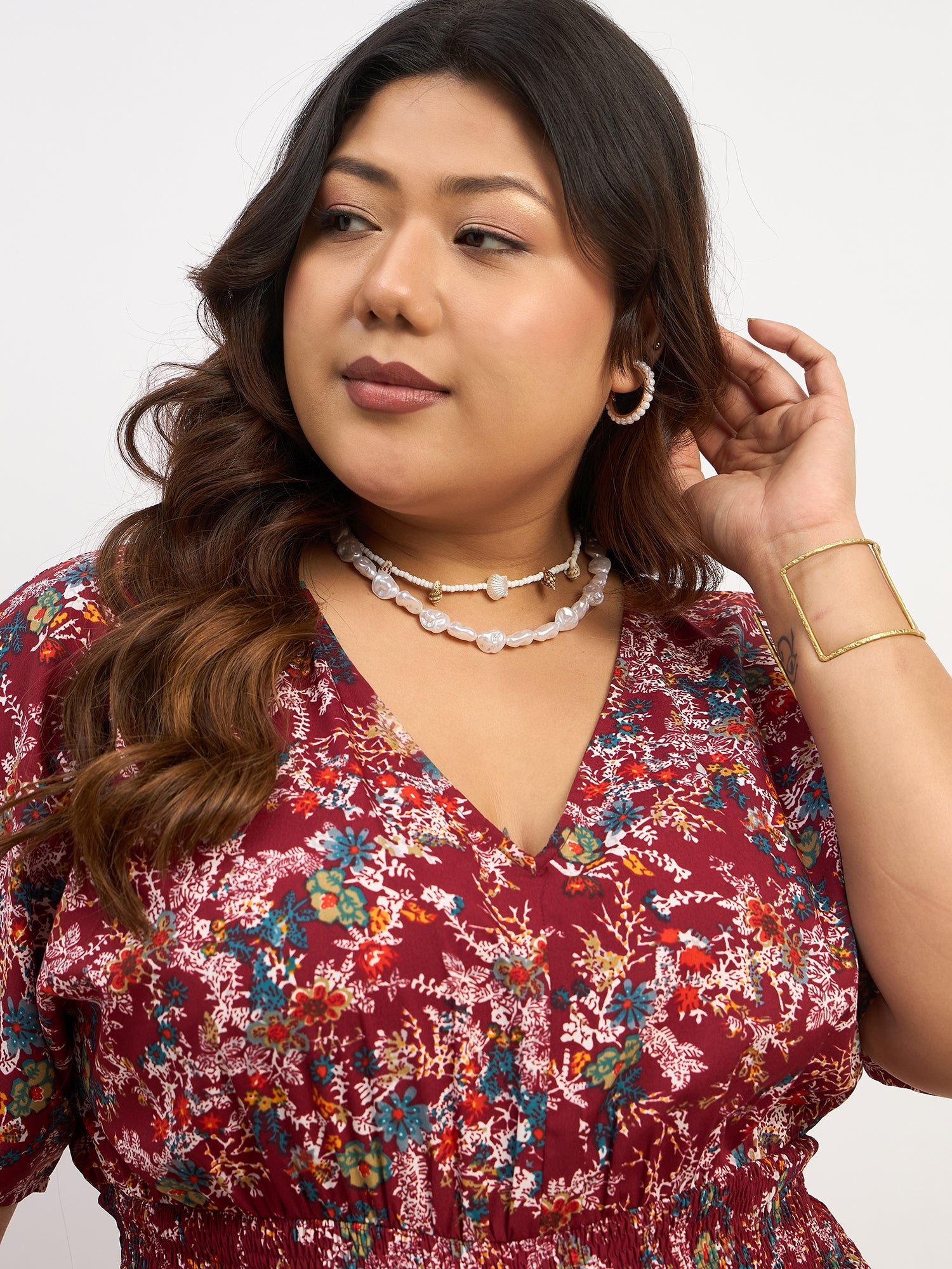 • Maroon colour tone with blue floral print presents a cinematic vibe from your look