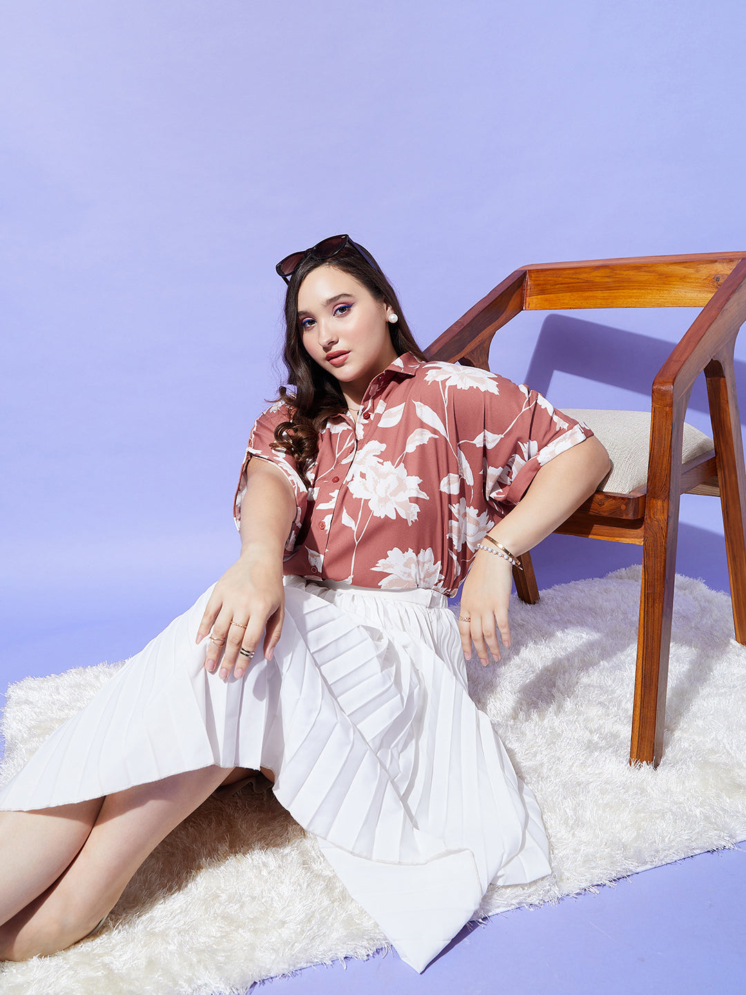 Berrylush Women Plus Size Brown & White Floral Printed Spread Collar Neck Batwing Sleeve Polyester Curved Hem Regular Shirt