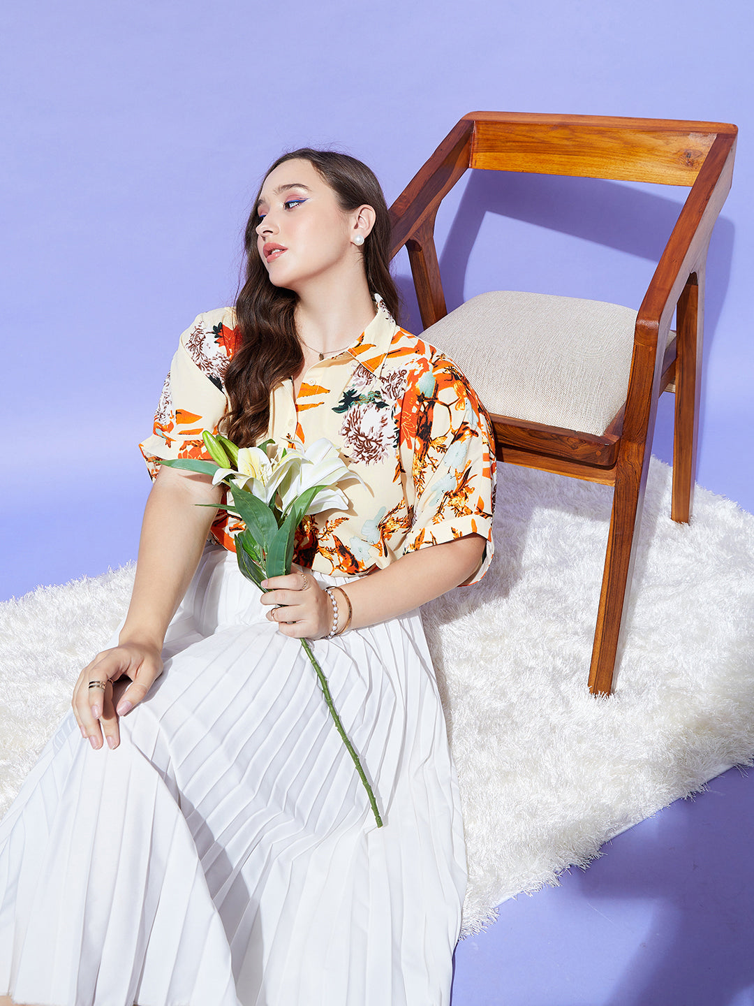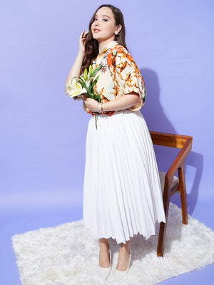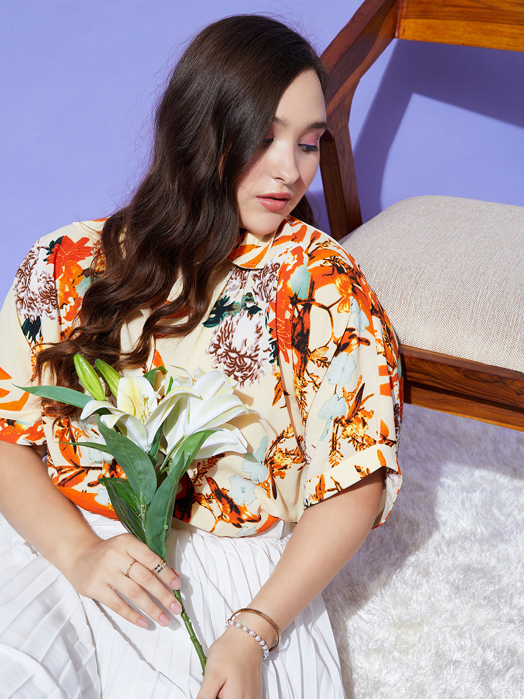 Berrylush Women Plus Size Beige & Orange Floral Printed Spread Collar Neck Batwing Sleeve Polyester Curved Hem Regular Shirt