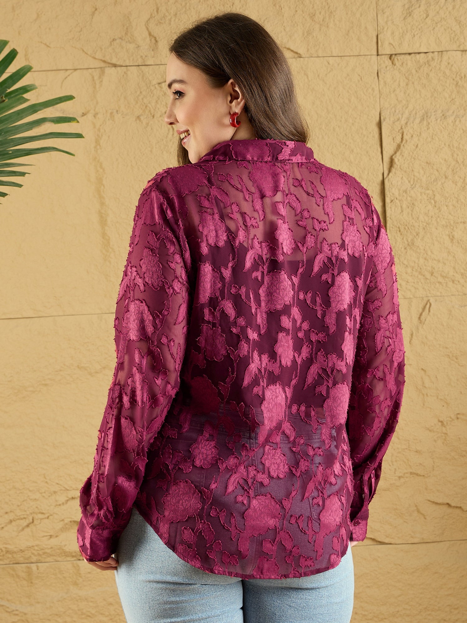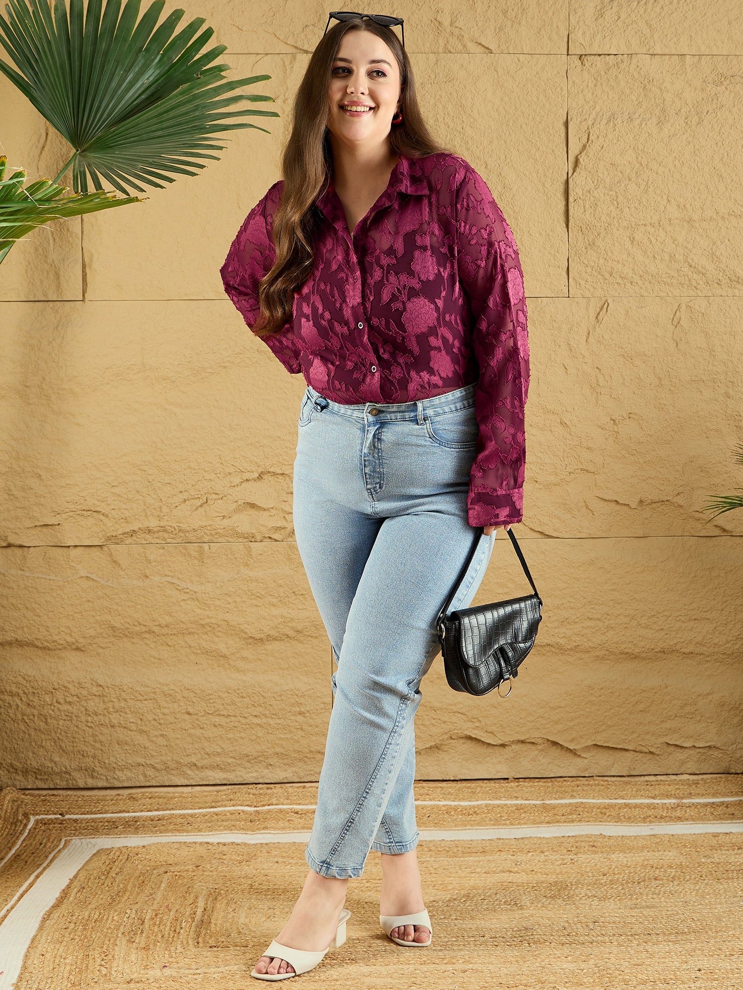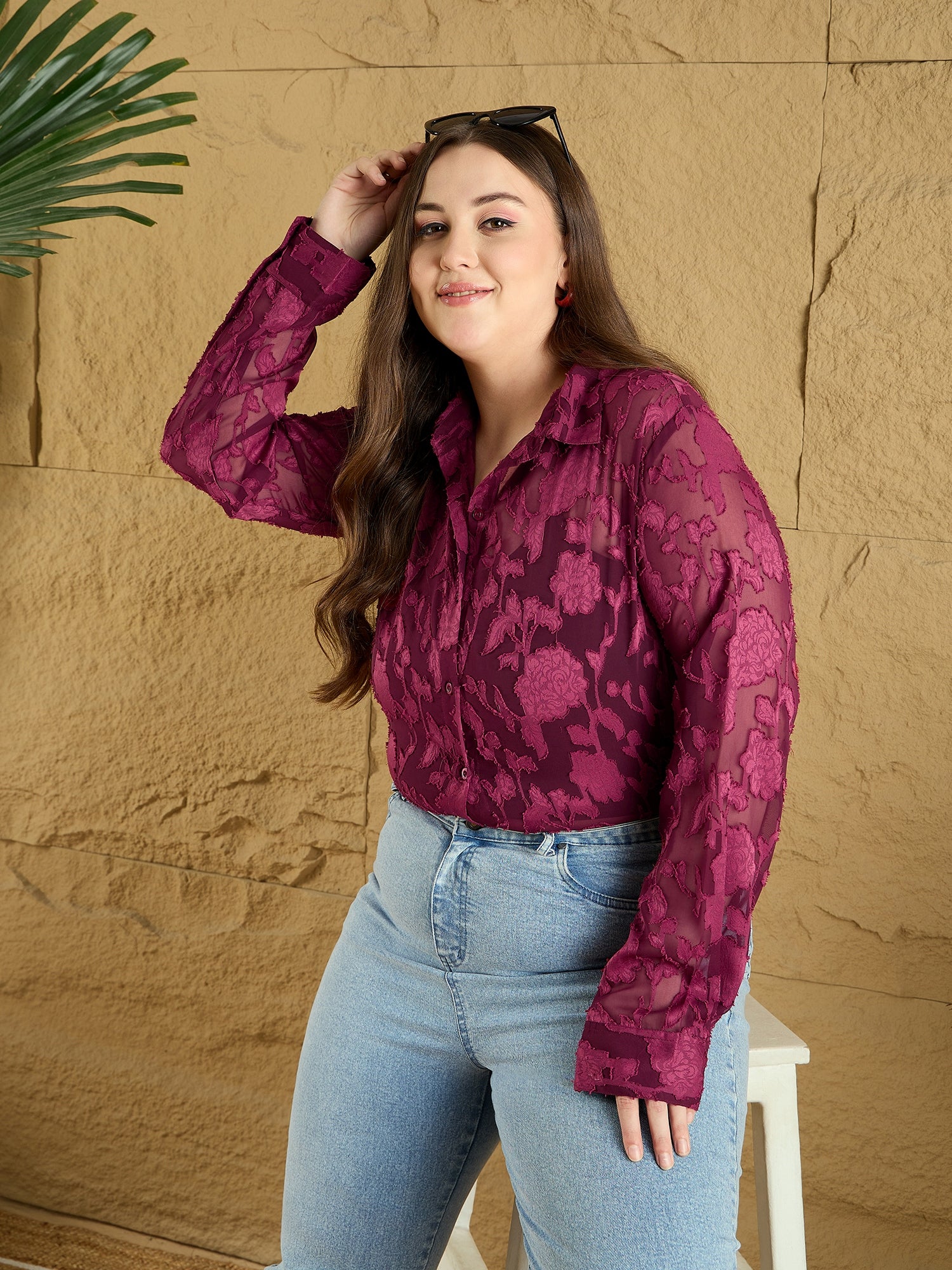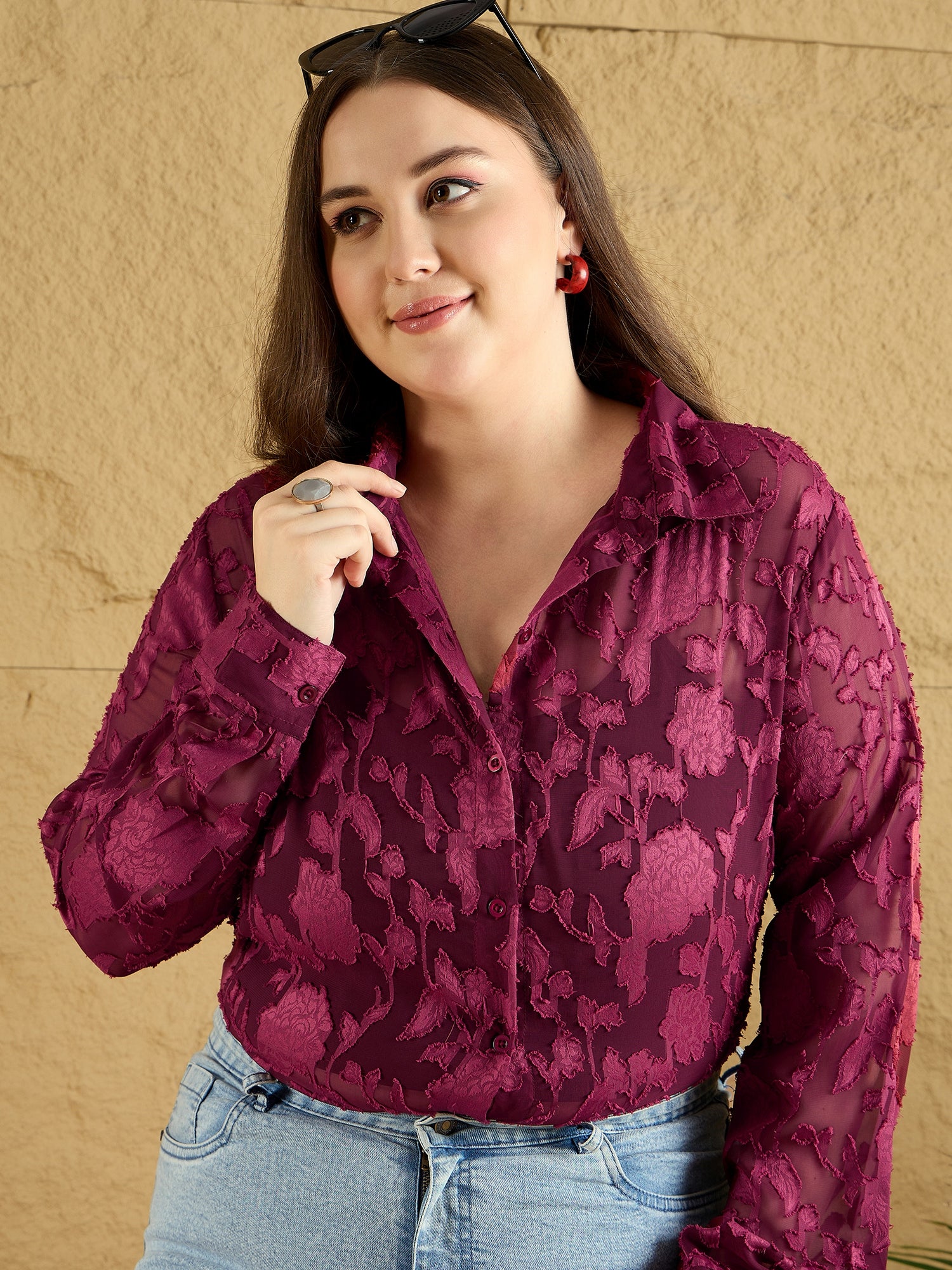 Berrylush Curve Women Maroon Floral Printed Spread Collar Neck Bishop Sleeves Button-Up Regular Shirt