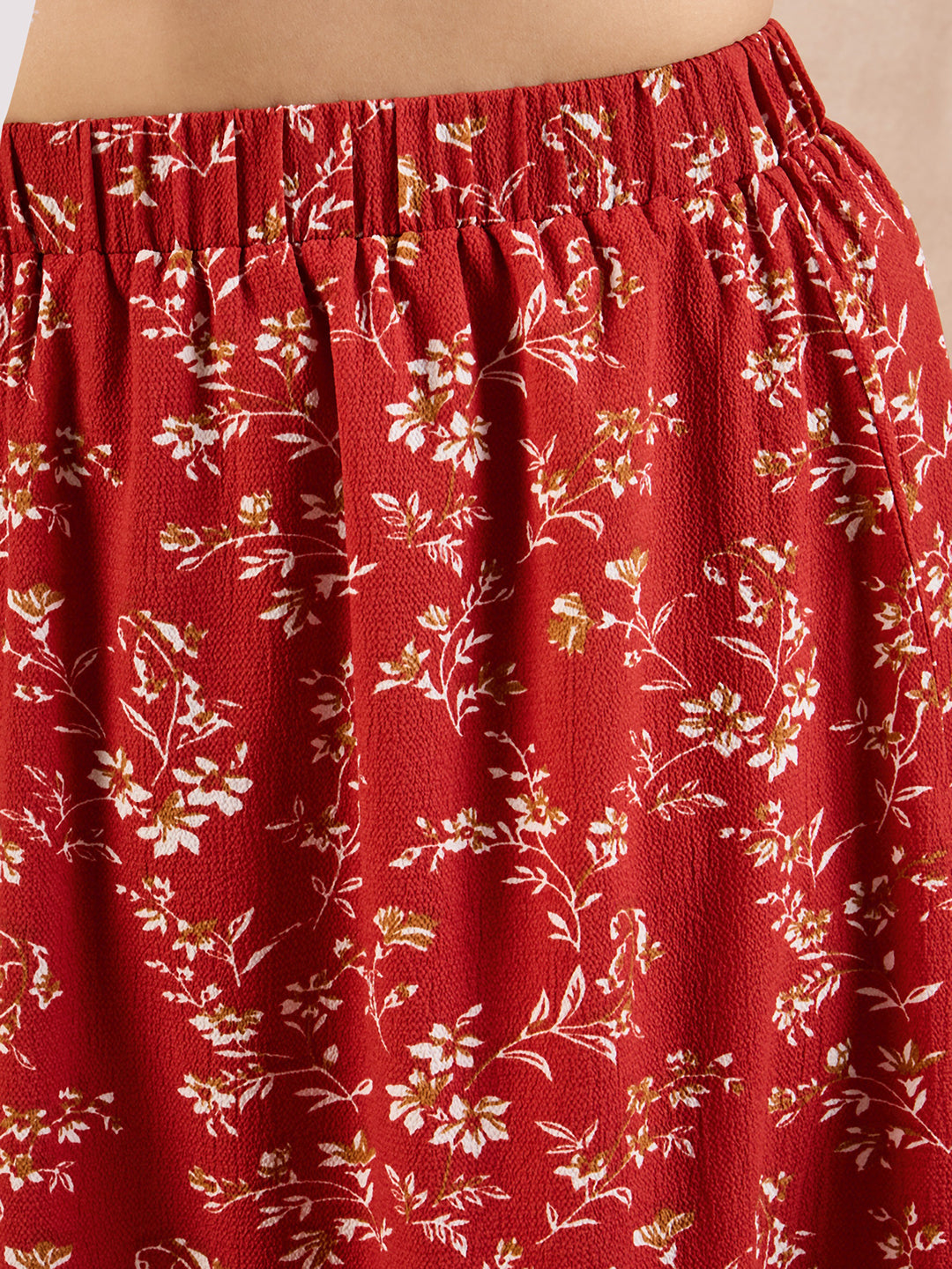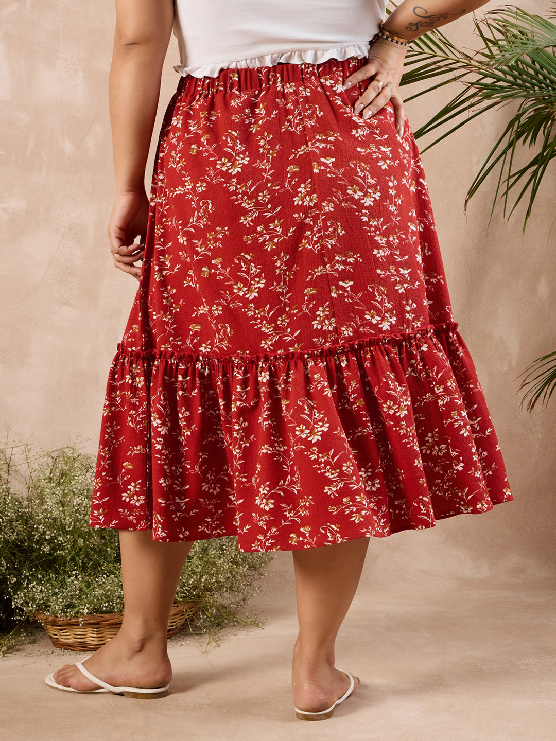 Berrylush Curve Women Red & White Floral Printed High-Rise Elastic Waist Slip-On Gathered A-Line Midi Skirt