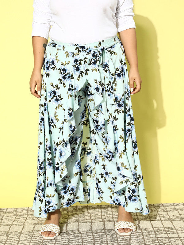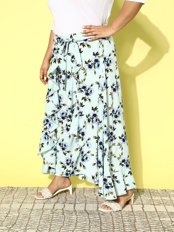 Berrylush Women Plus Size Green & Blue Floral Printed Crepe Tie-Up High-Rise Waist Slip-On Flared Maxi Skirt