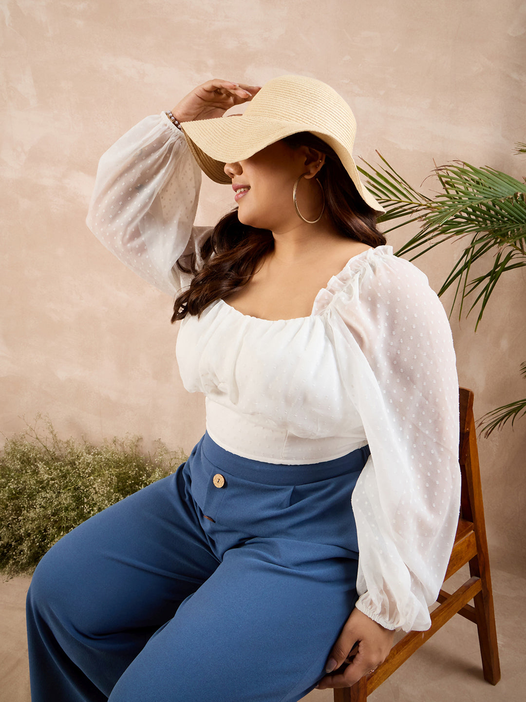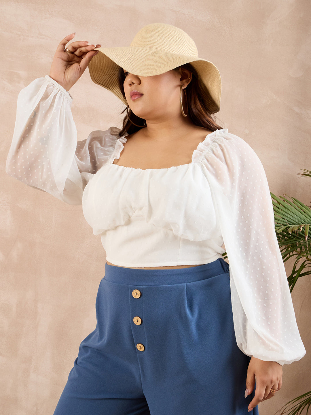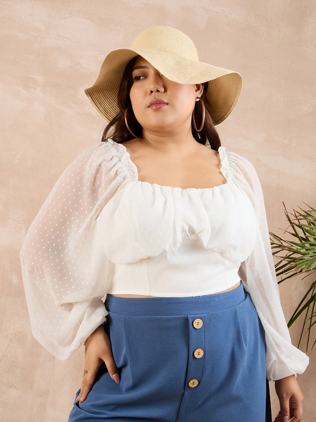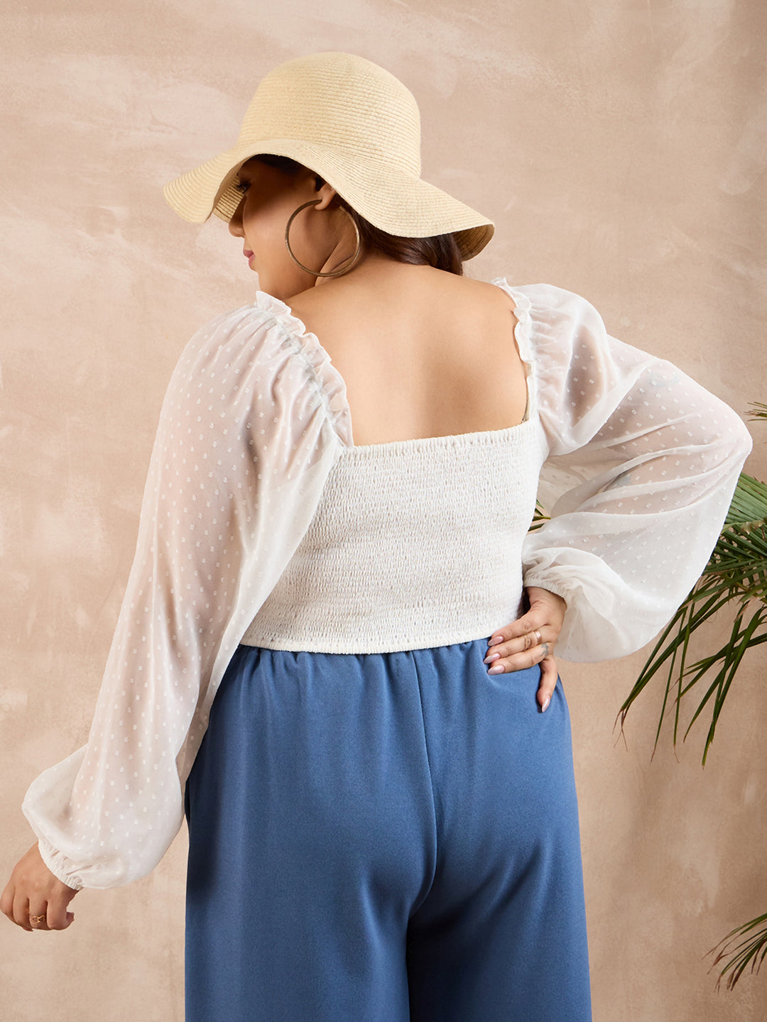 Berrylush Curve Women Solid White Dobby Weave Sweetheart Neck Puff Sleeves Smocked Crop Top
