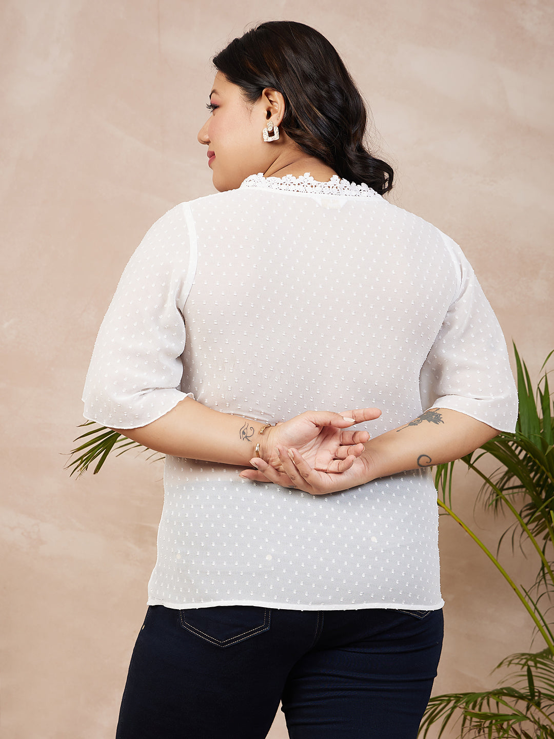 Berrylush Women Plus Size Solid White Dobby Weave V-Neck Flutter Sleeves Georgette Lace-Up Regular Top
