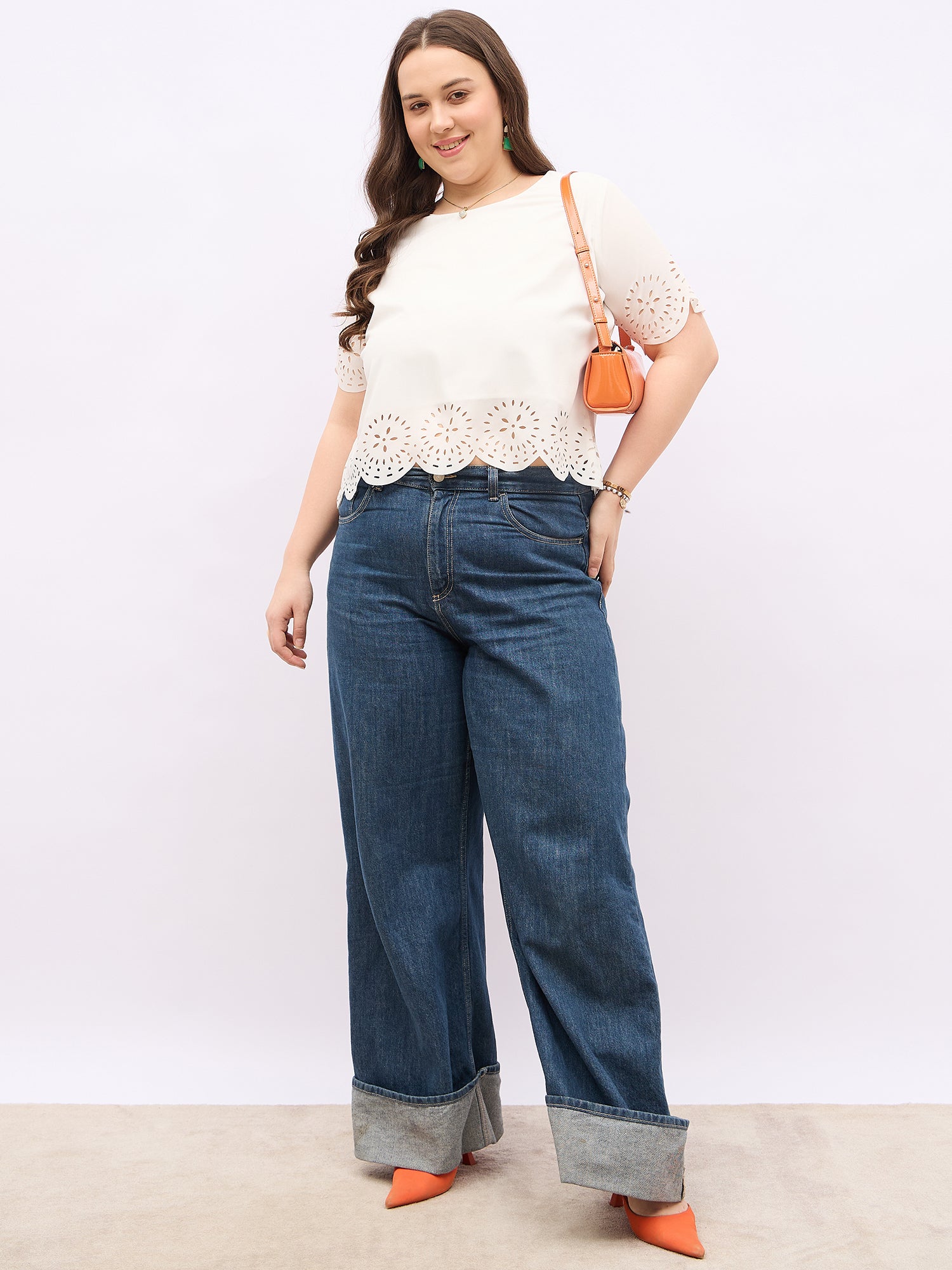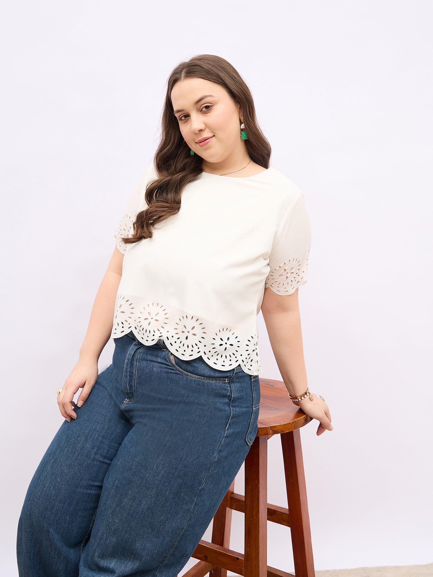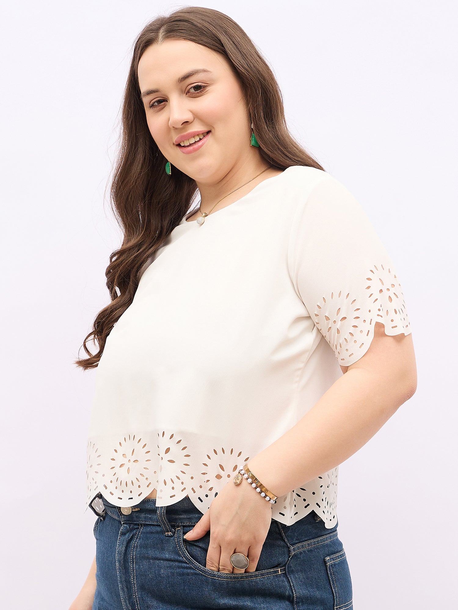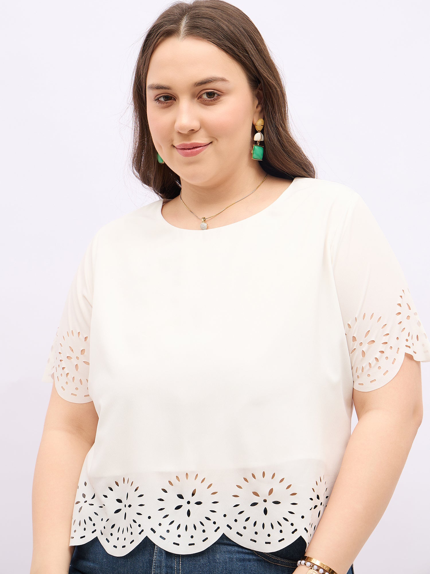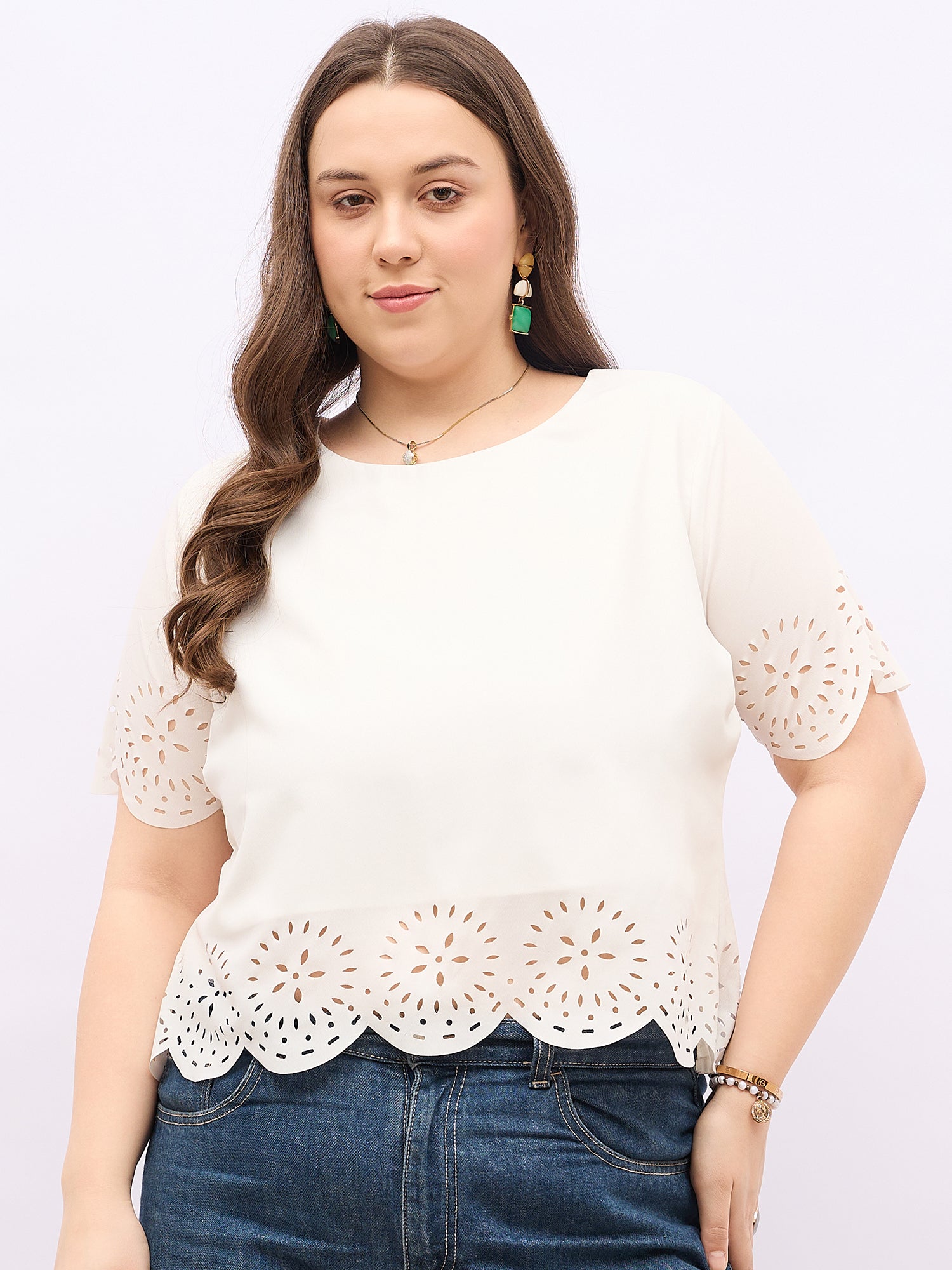 Berrylush Curve Women White Solid Round Neck Short Sleeve Regular Top