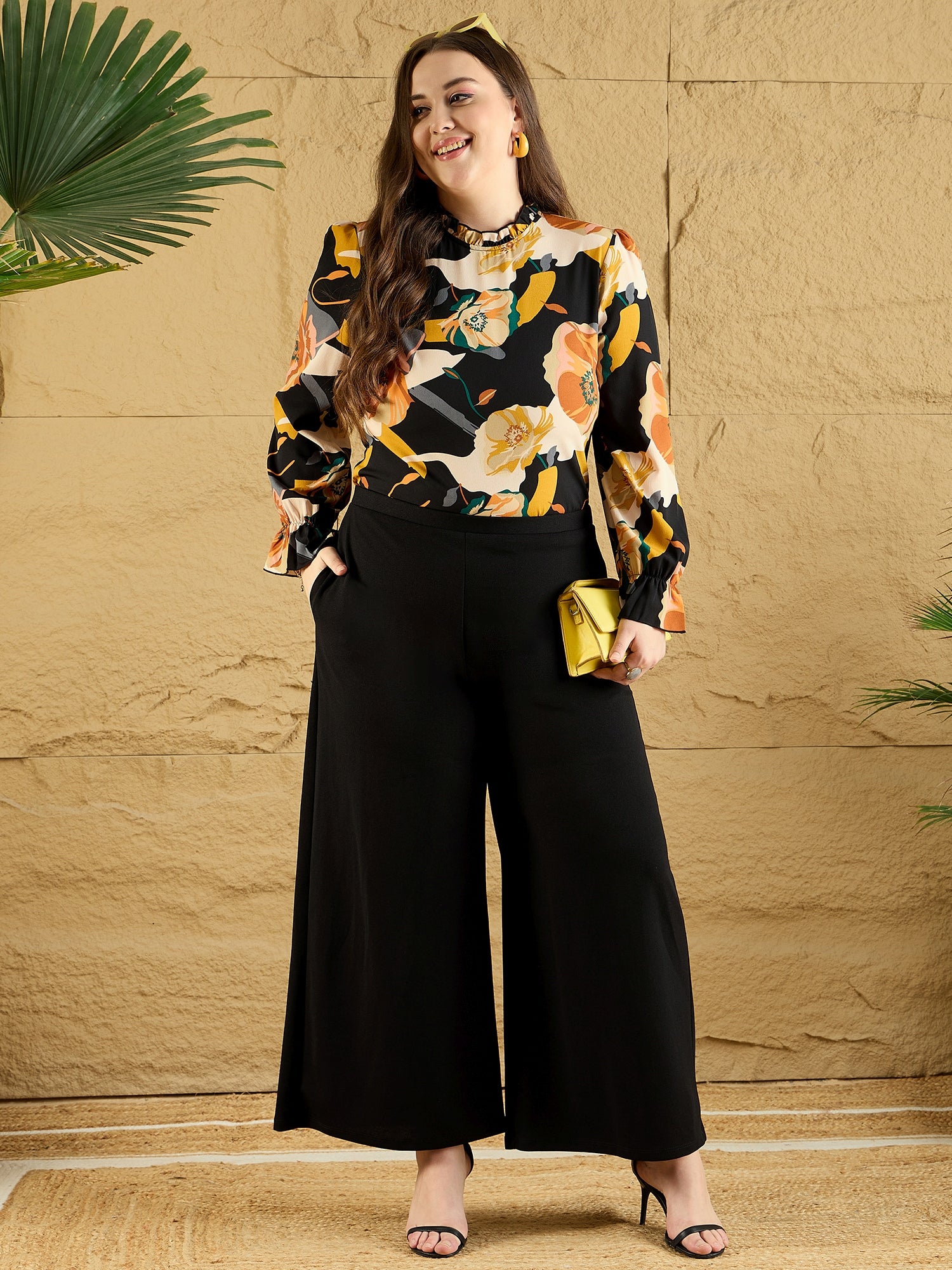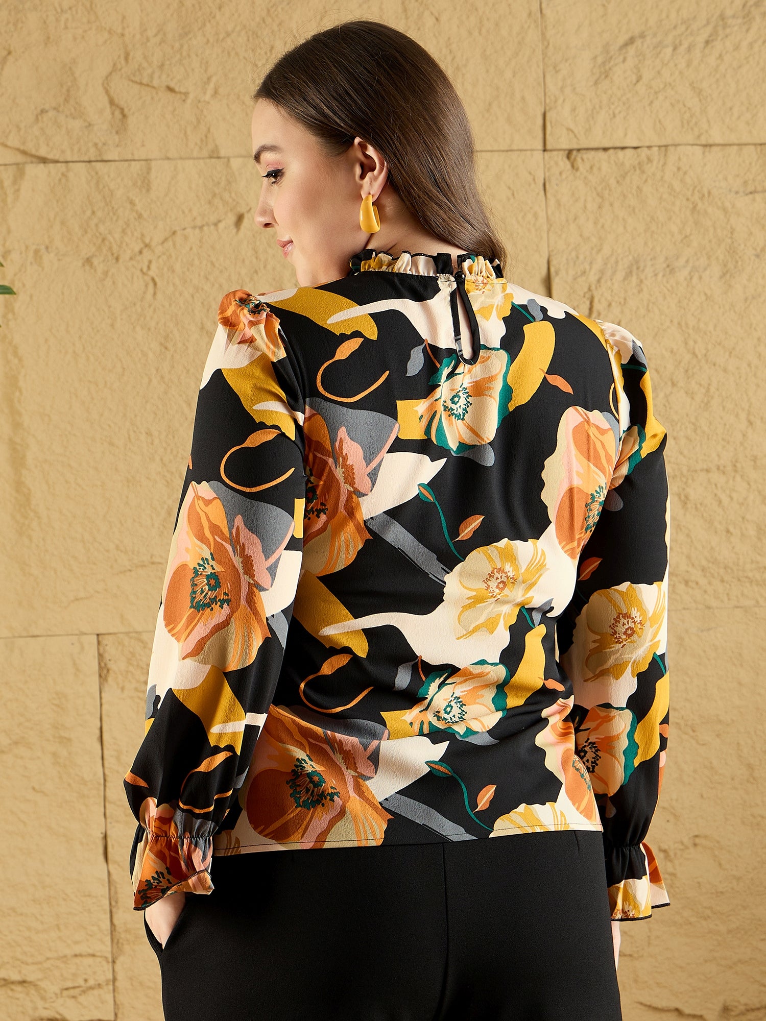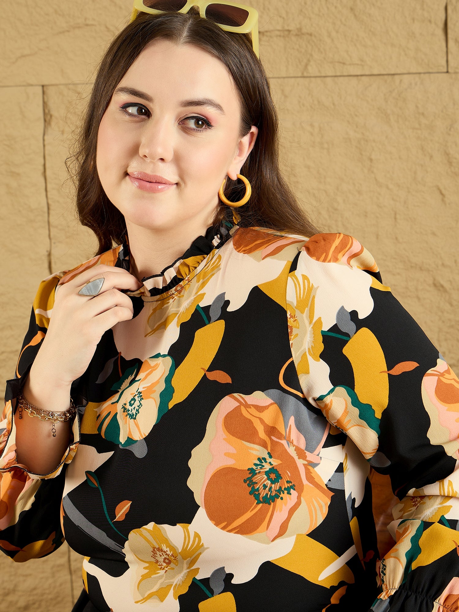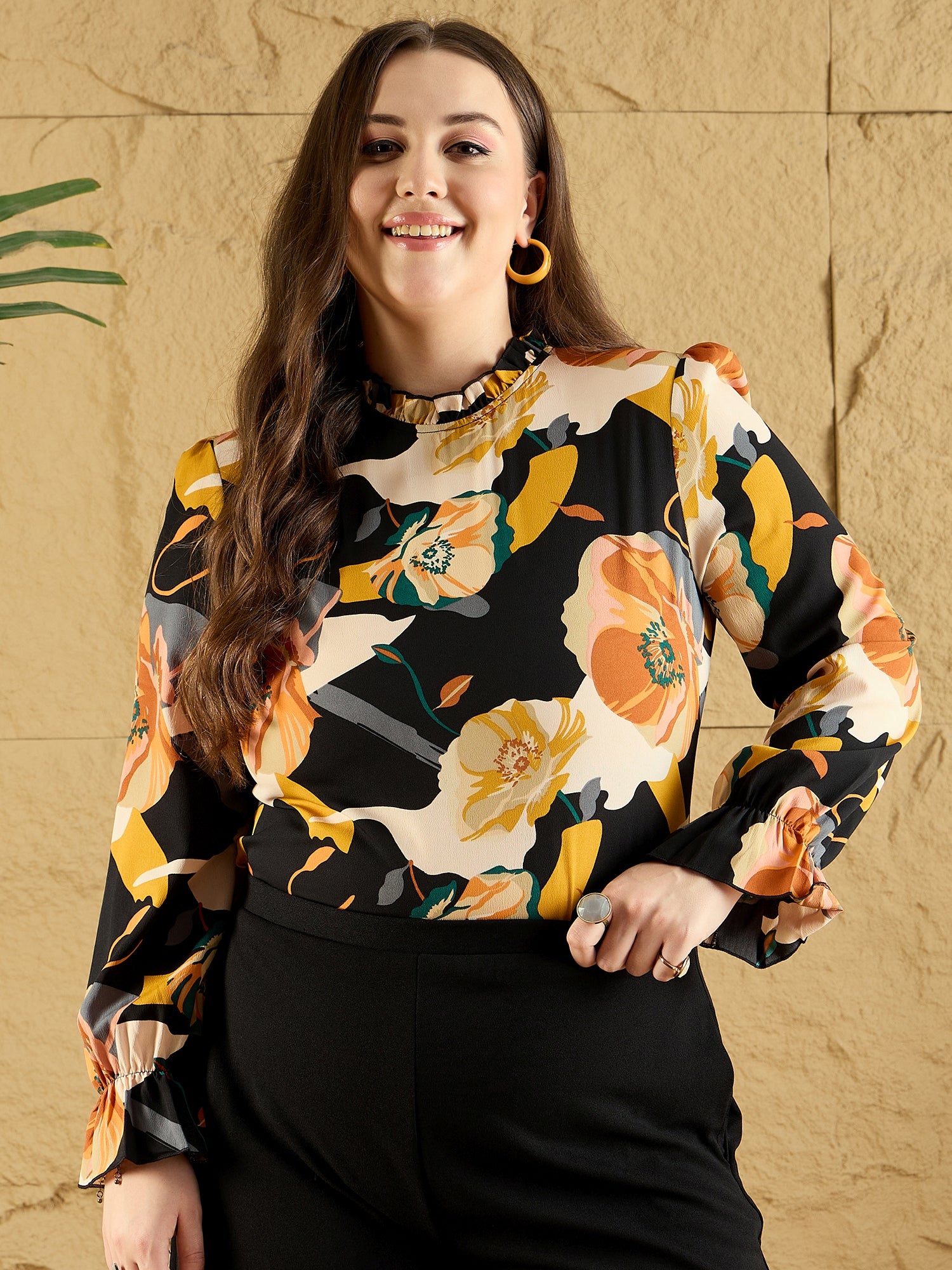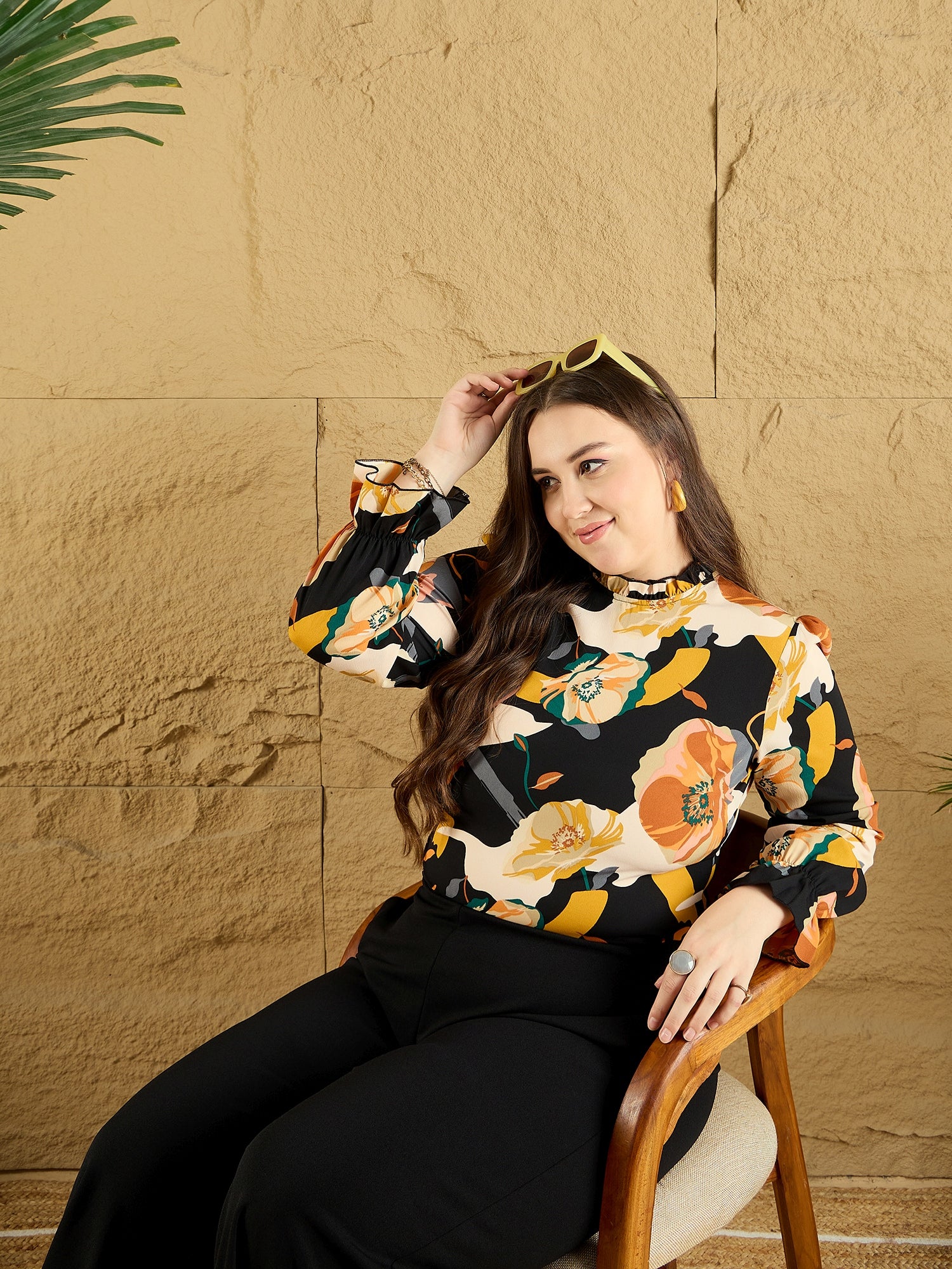 Berrylush Curve Women Black & Yellow Floral Printed High Neck Bell Sleeves Back Keyhole Regular Top