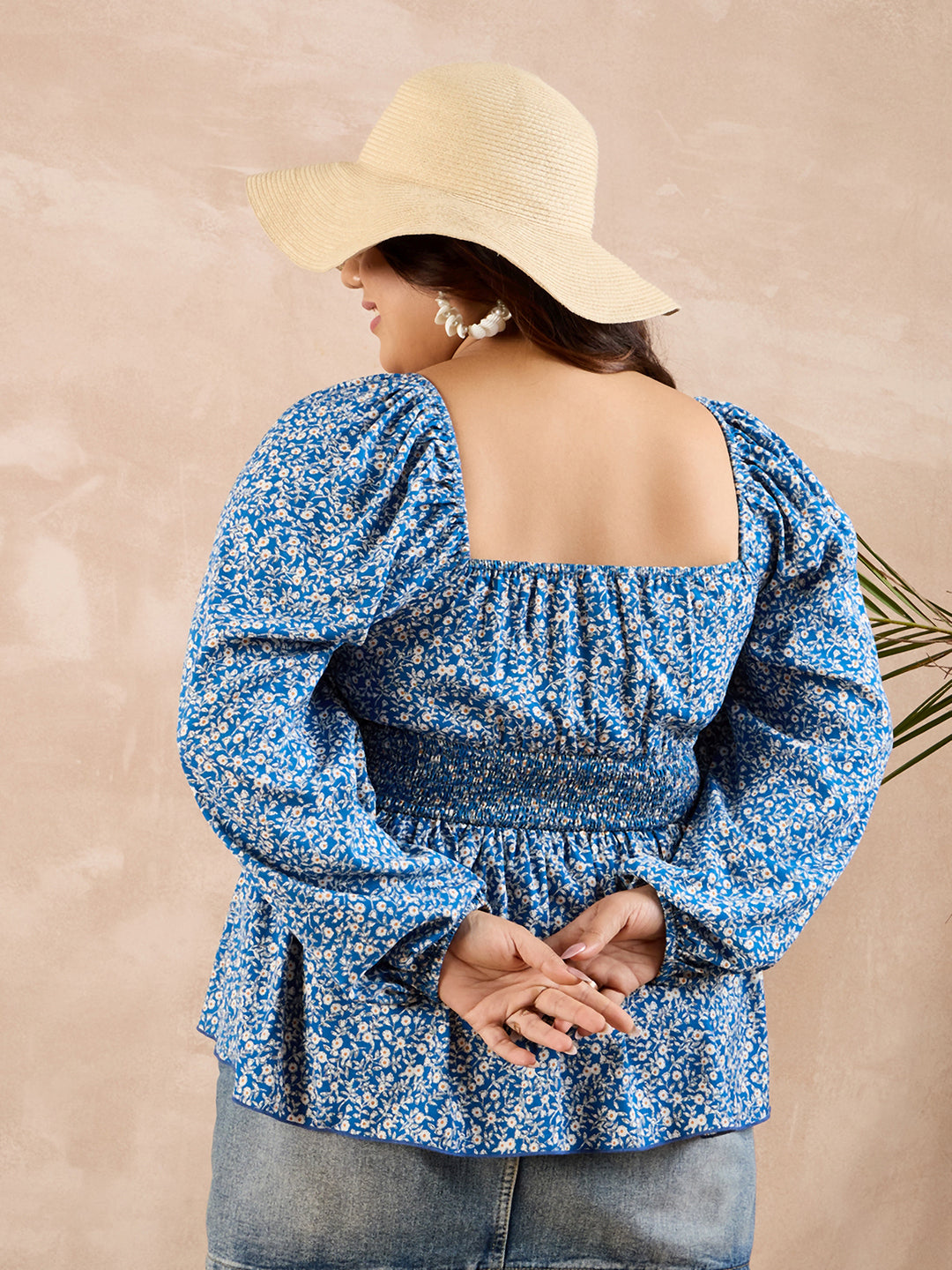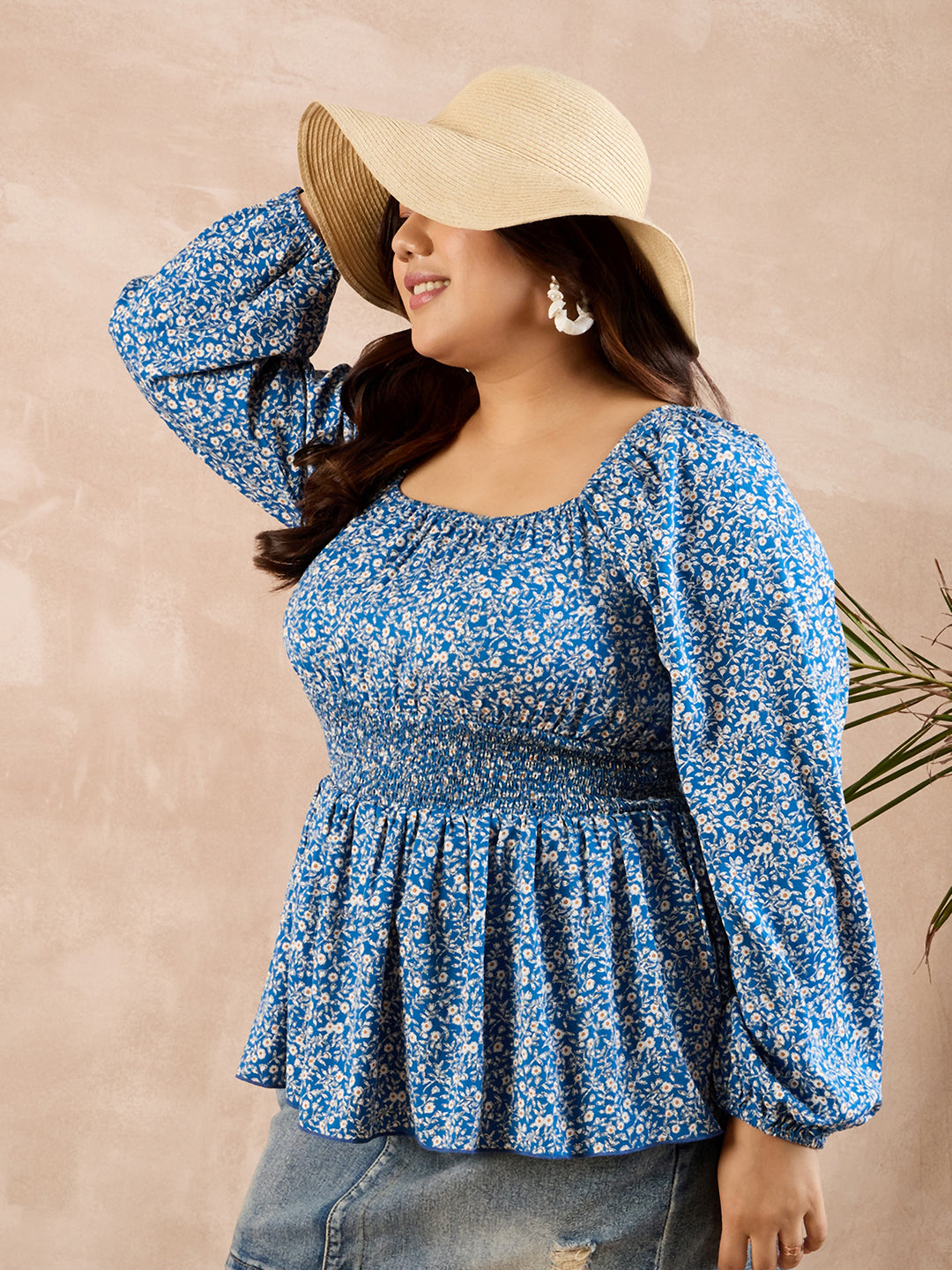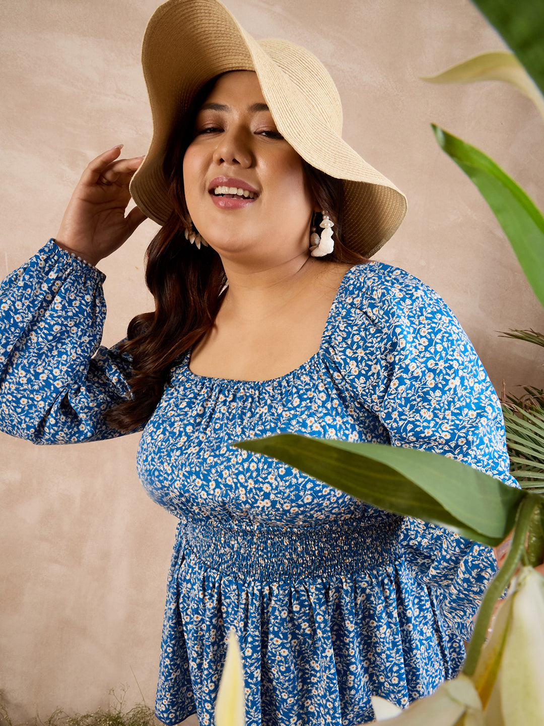 Berrylush Curve Women Blue & White Floral Printed Square Neck Puff Sleeves Smocked Waist Pleated Peplum Regular Top