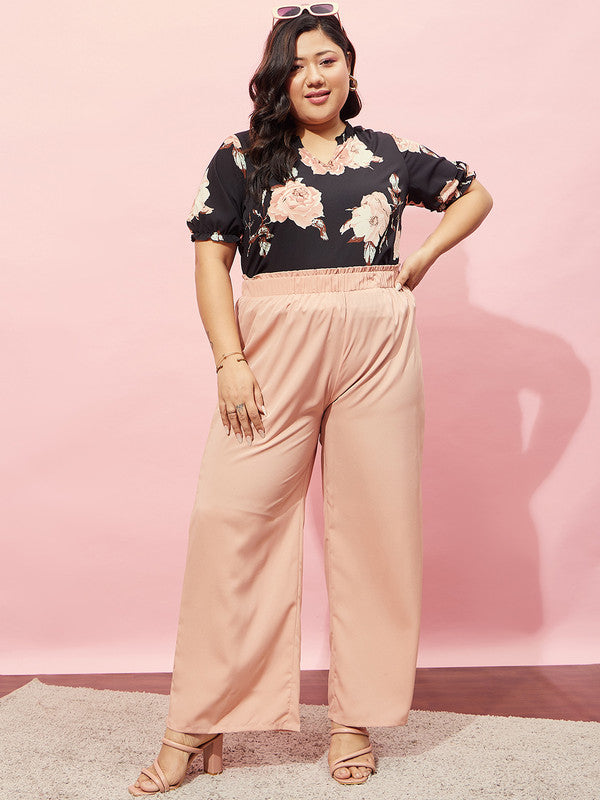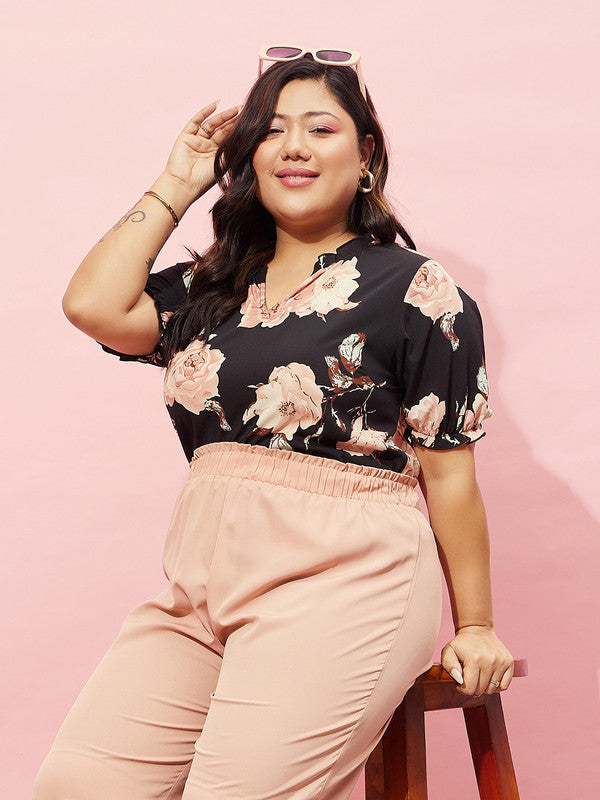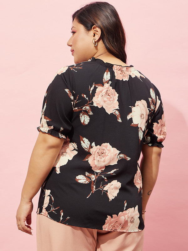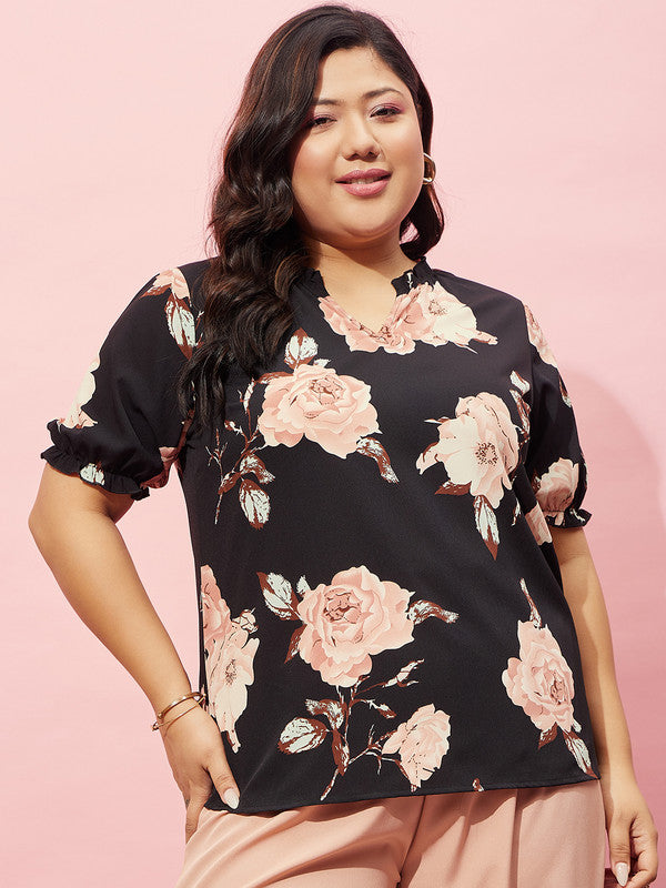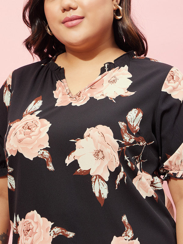 Berrylush Curve Women Black & Pink Floral Printed V-Neck Short Sleeves Regular Top