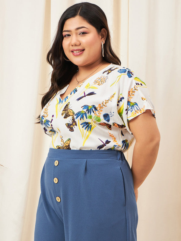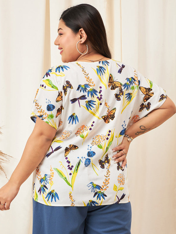 Berrylush Curve Women White & Multicolour Nature Printed V-Neck Short Sleeves Regular Top