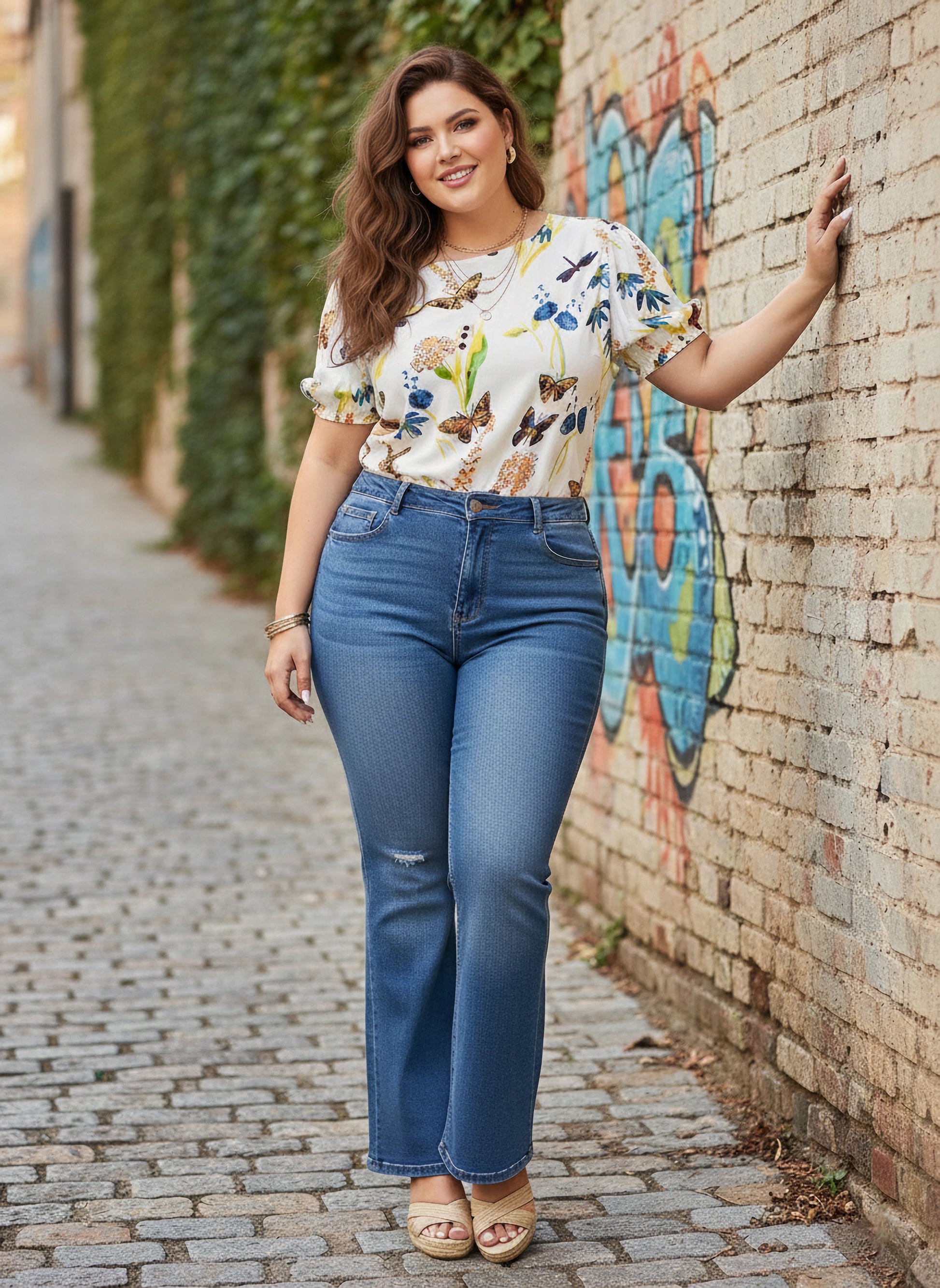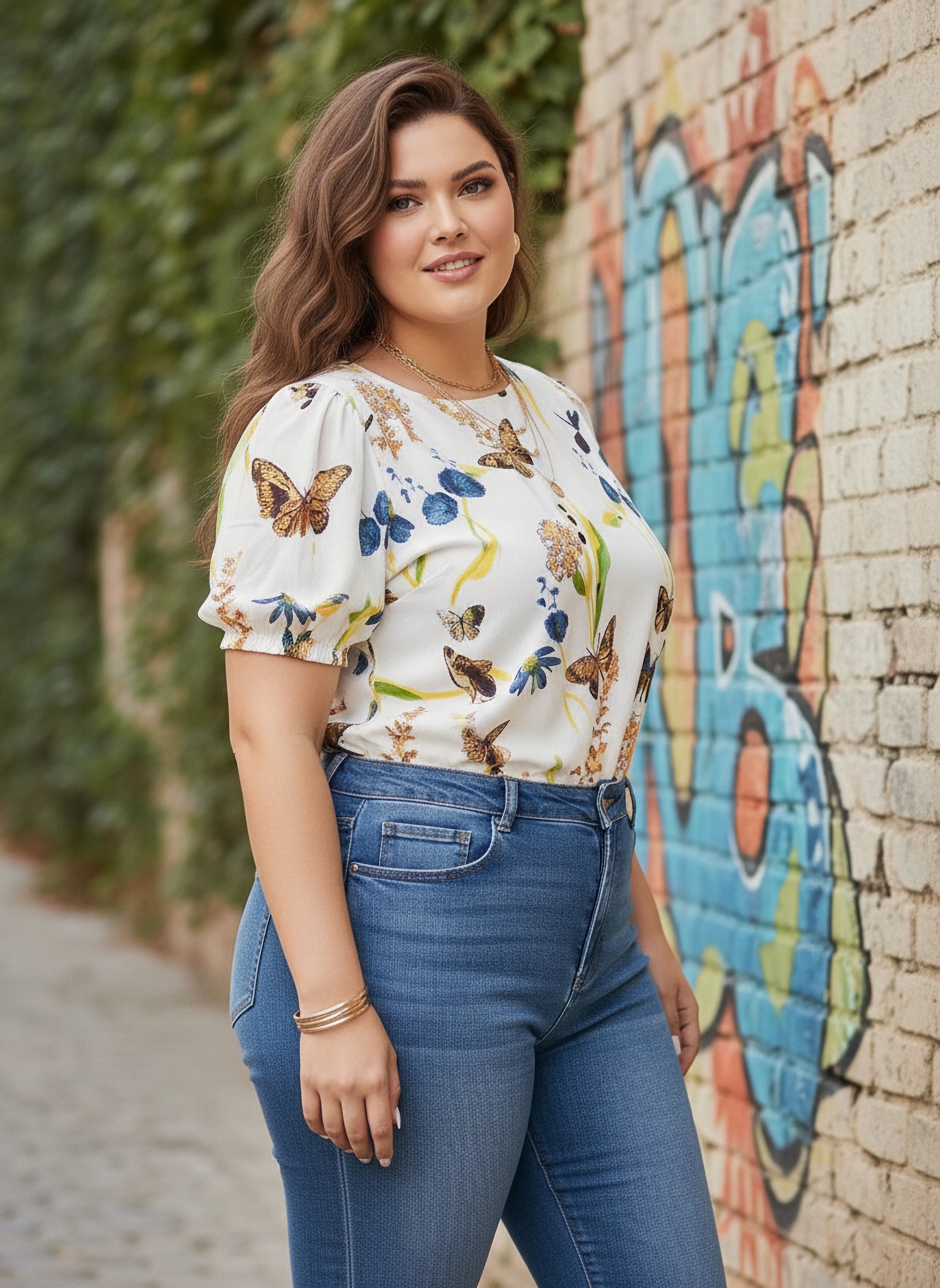 Introducing the Berrylush Curve White & Multicolour Nature Printed Top – a delightful blend of style and comfort. Crafted with soft, breathable viscose rayon, this top features a vivid nature-inspired print that brings a fresh vibe to any outfit. The stylish round neckline and eye-catching back cutout with an adjustable tie-up closure add unique touches to this smart casual attire. Short puff sleeves enhance its playful charm while ensuring ease of movement. Perfect for various occasions, it promises both elegance and versatility in your wardrobe!
