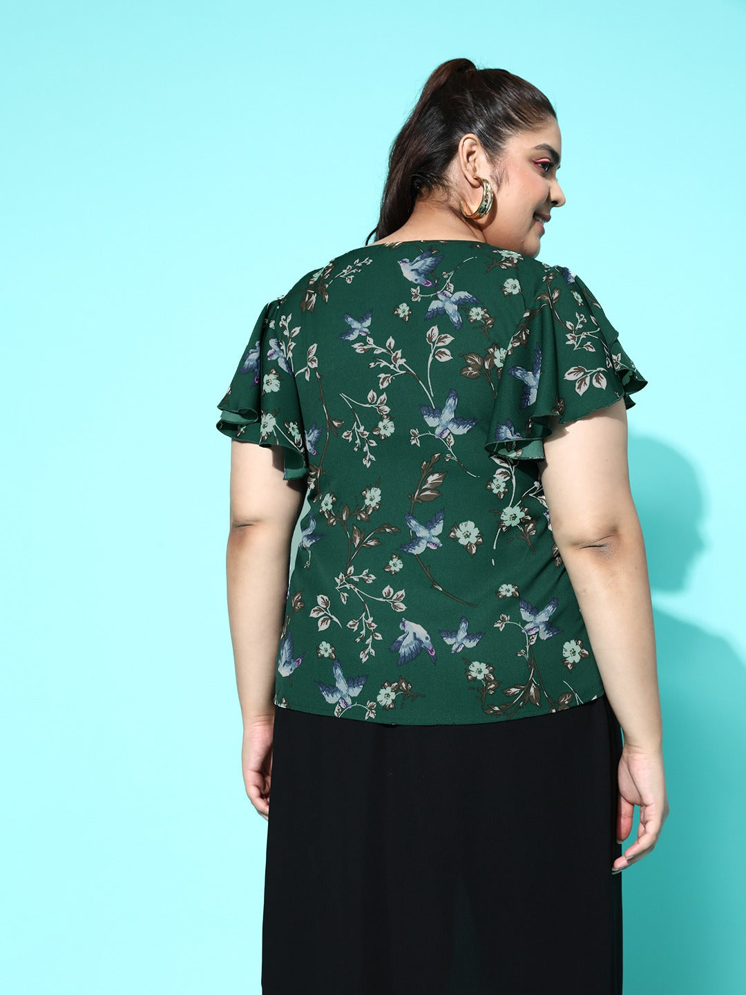 Berrylush Women Plus Size Green & White Floral Printed V-Neck Flutter Sleeve Crepe Ruffled Regular Top