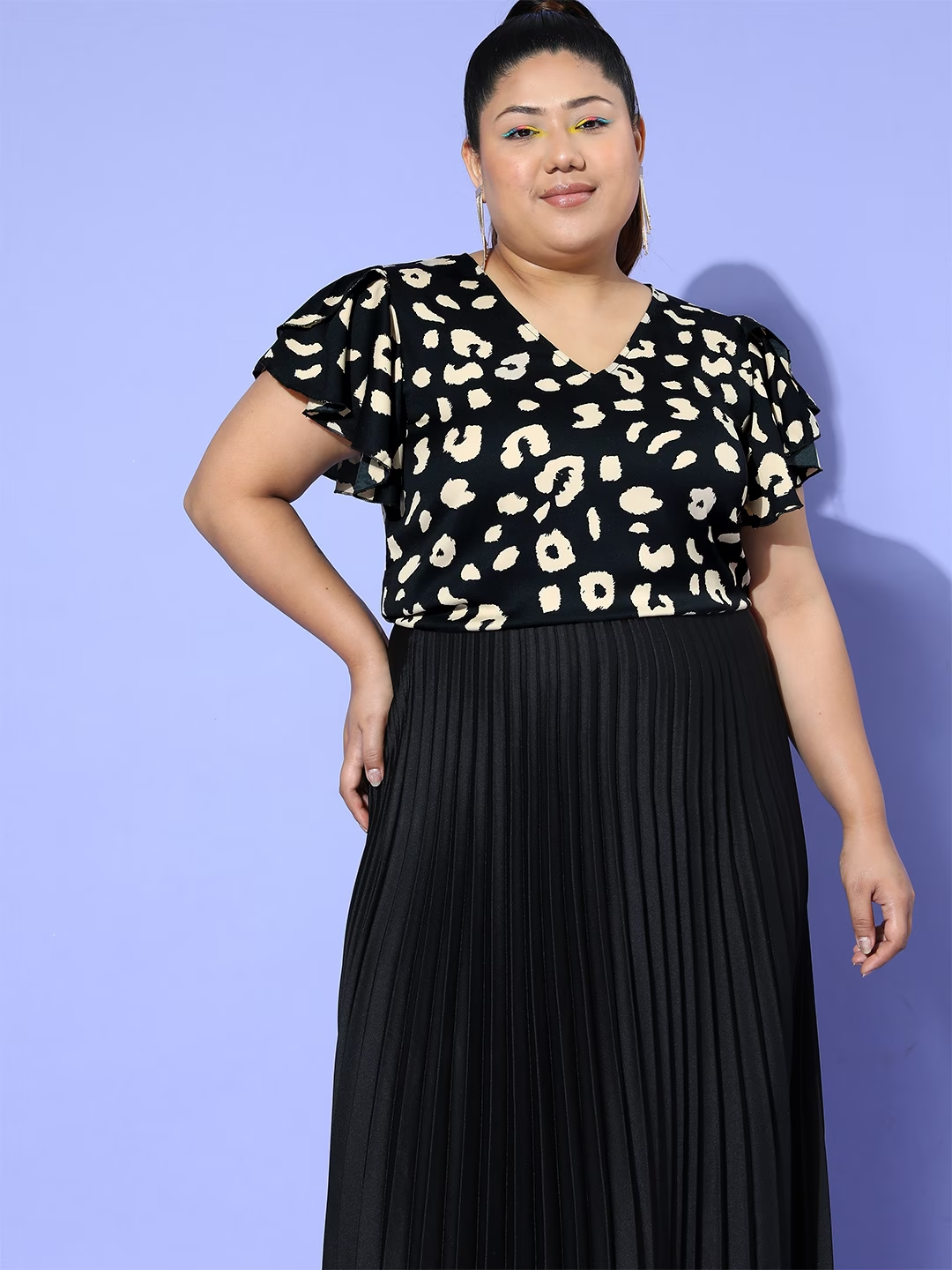 Berrylush Women Plus Size Black & White Animal Printed V-Neck Flutter Sleeve Crepe Ruffled Regular Top