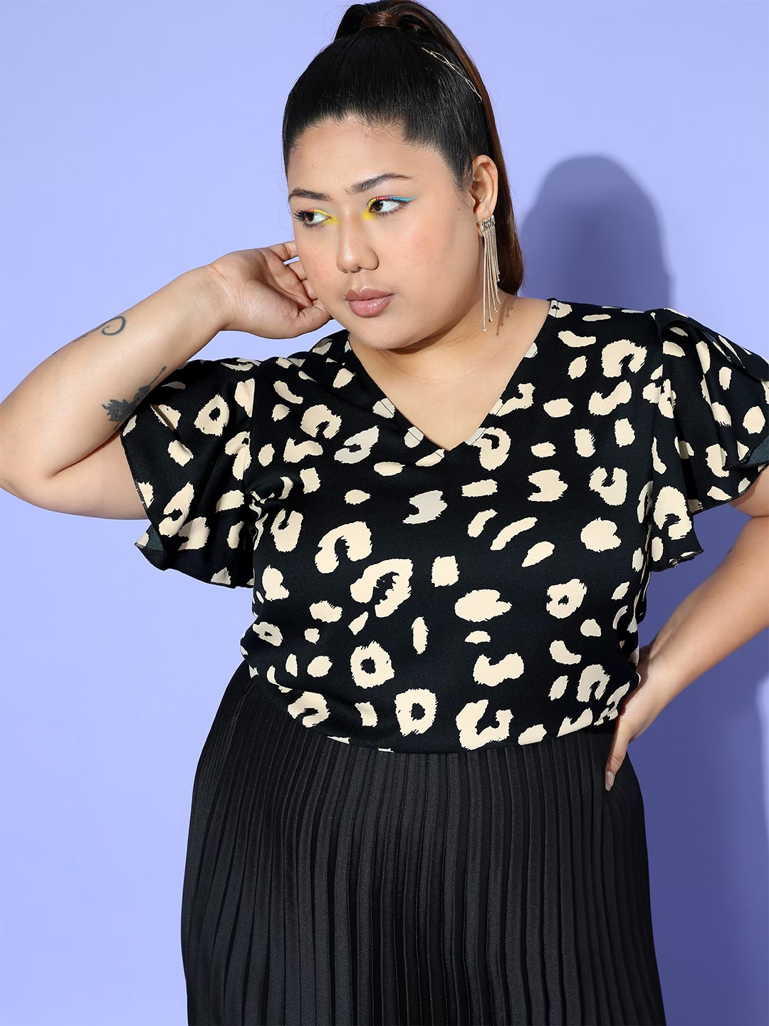 Seize the day with the trendiest style by abandoning boring fashion and embracing vibrant options just like this radiant Black & White Animal Printed V-Neck Flutter Sleeve Crepe Ruffled Regular Top introduced from the premium curve section of Berrylush. Adorned with a splash of colours with a captivating mixture of black and white animal print that lends this top fabulous while giving away a chic vibe. Gracefully designed with a deep V-neck design that gives your neckline exotic and edgy appeal with a vertical impression. In addition, the woven weave offers uninterrupted body movement with a delicate touch against your skin and a tint of elasticity. Complete your casual look effortlessly by teaming this ruffled top with white denim jeans, floral stud earrings, comfy sandals, and a cute side bag.
