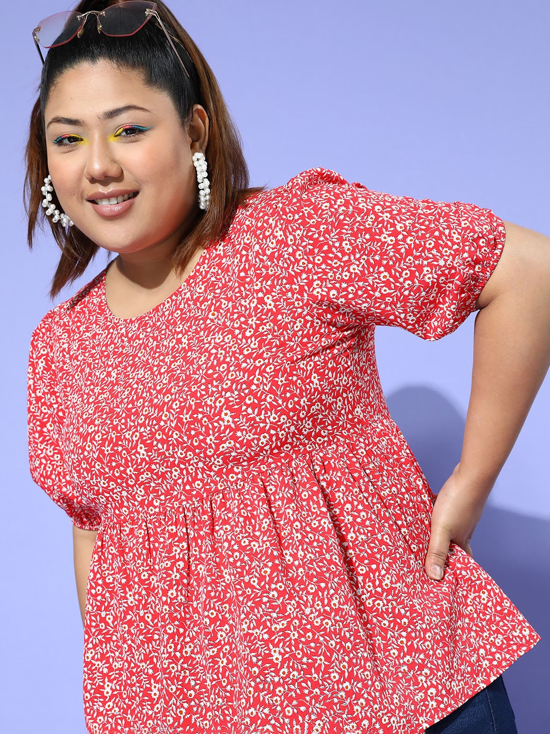 Berrylush Women Plus Size Red & White Floral Printed Round Neck Button-Up Crepe Pleated Regular Top