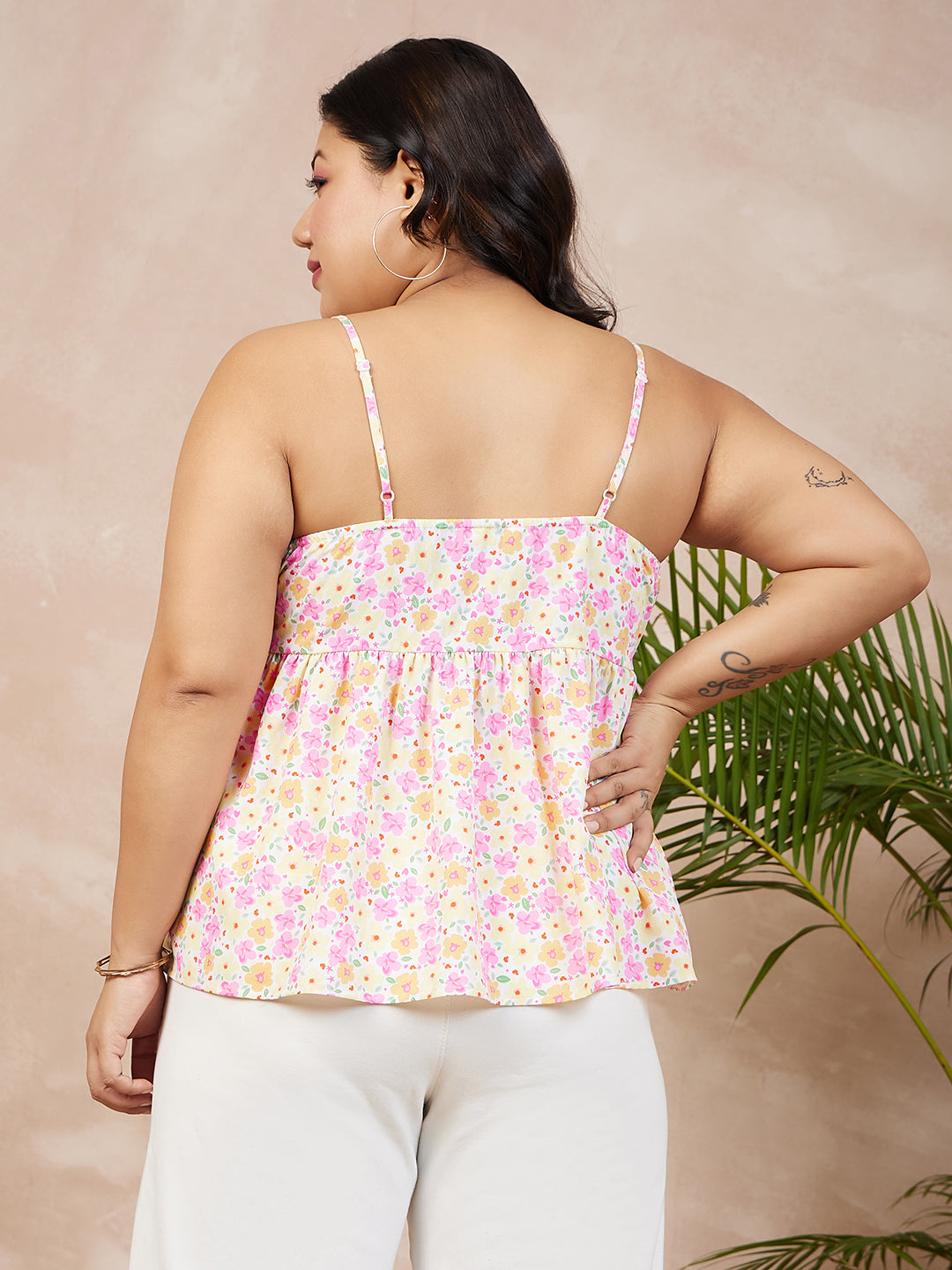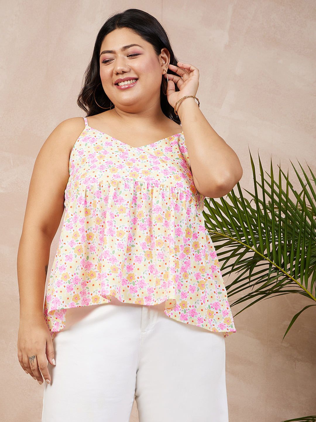 Berrylush Women Plus Size White, Yellow, & Pink Floral Printed V-Neck Sleeveless Crepe Pleated Empire Top