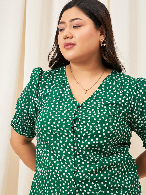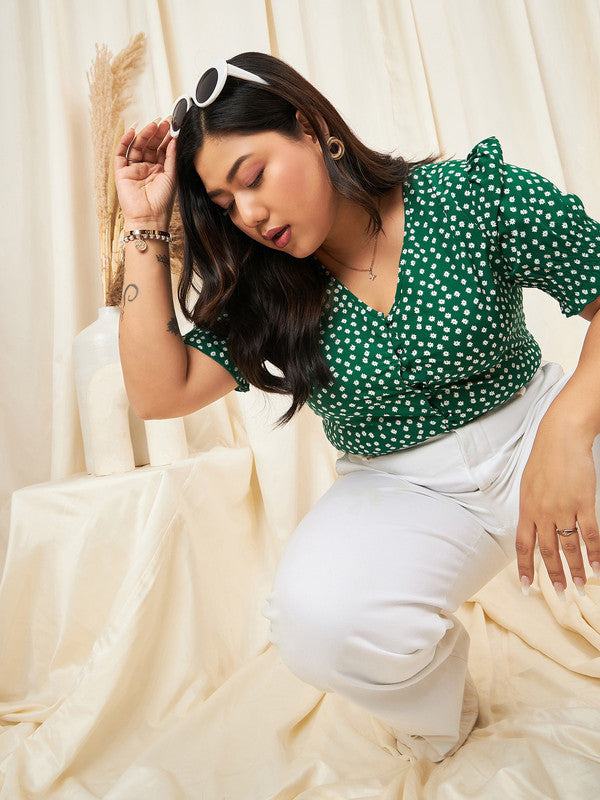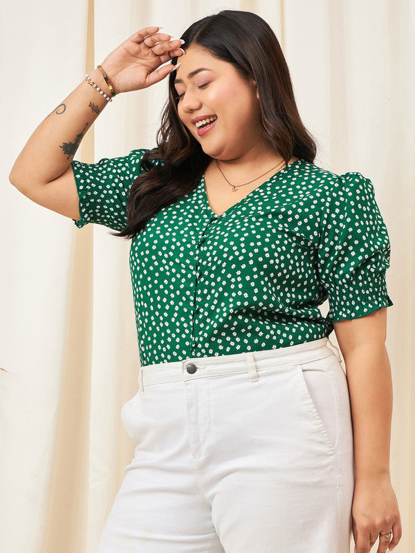 Berrylush Curve Women Green & White Floral Printed V-Neck Puff Sleeves Button-Up Smocked Regular Top
