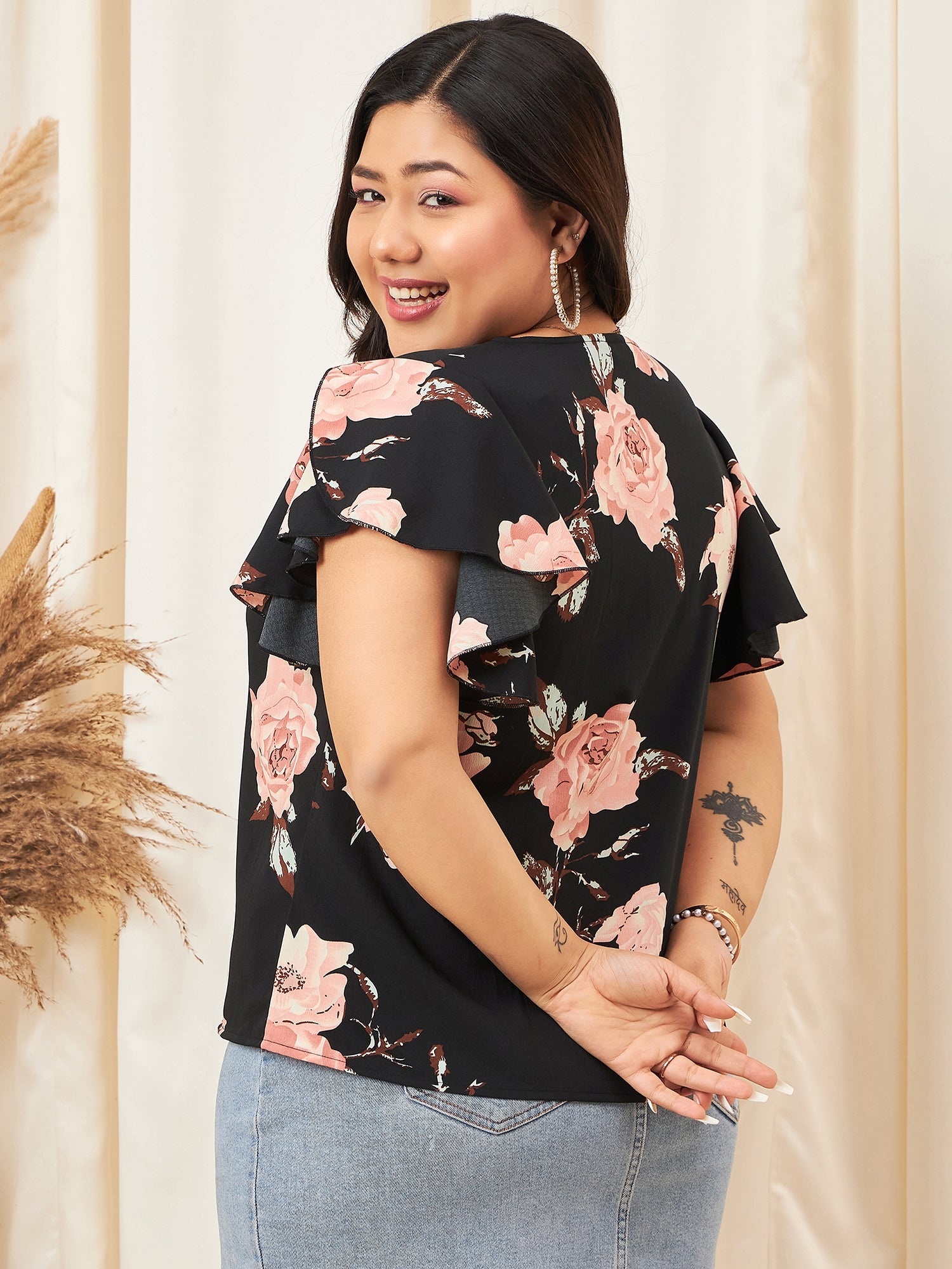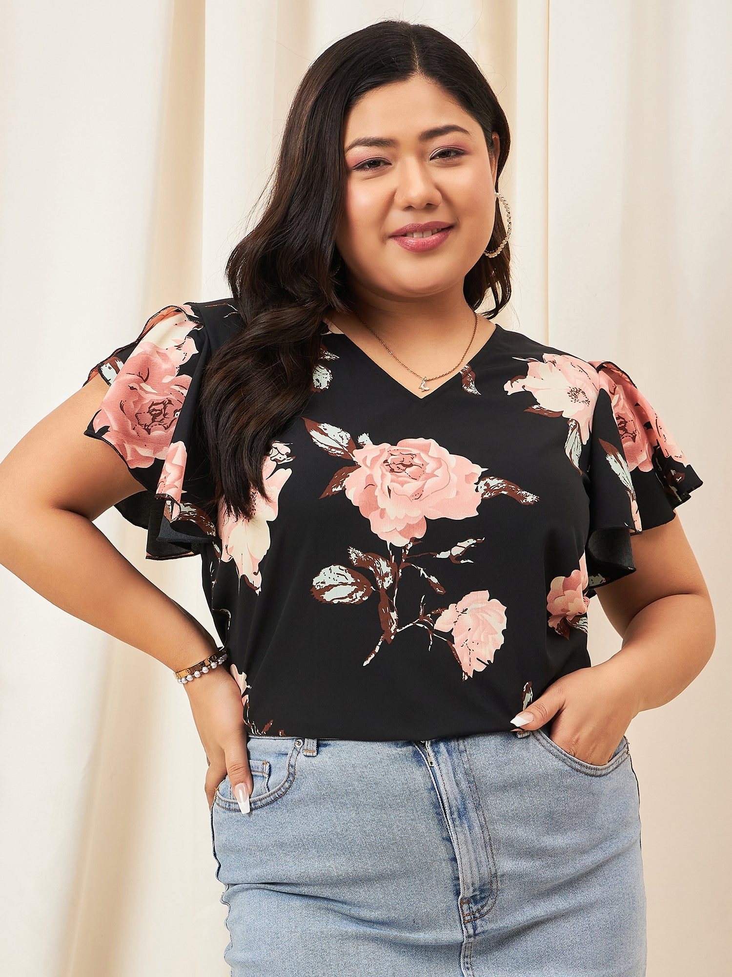 Berrylush Curve Women Black & Pink Floral Printed V-Neck Flutter Sleeves Slip-On Regular Top