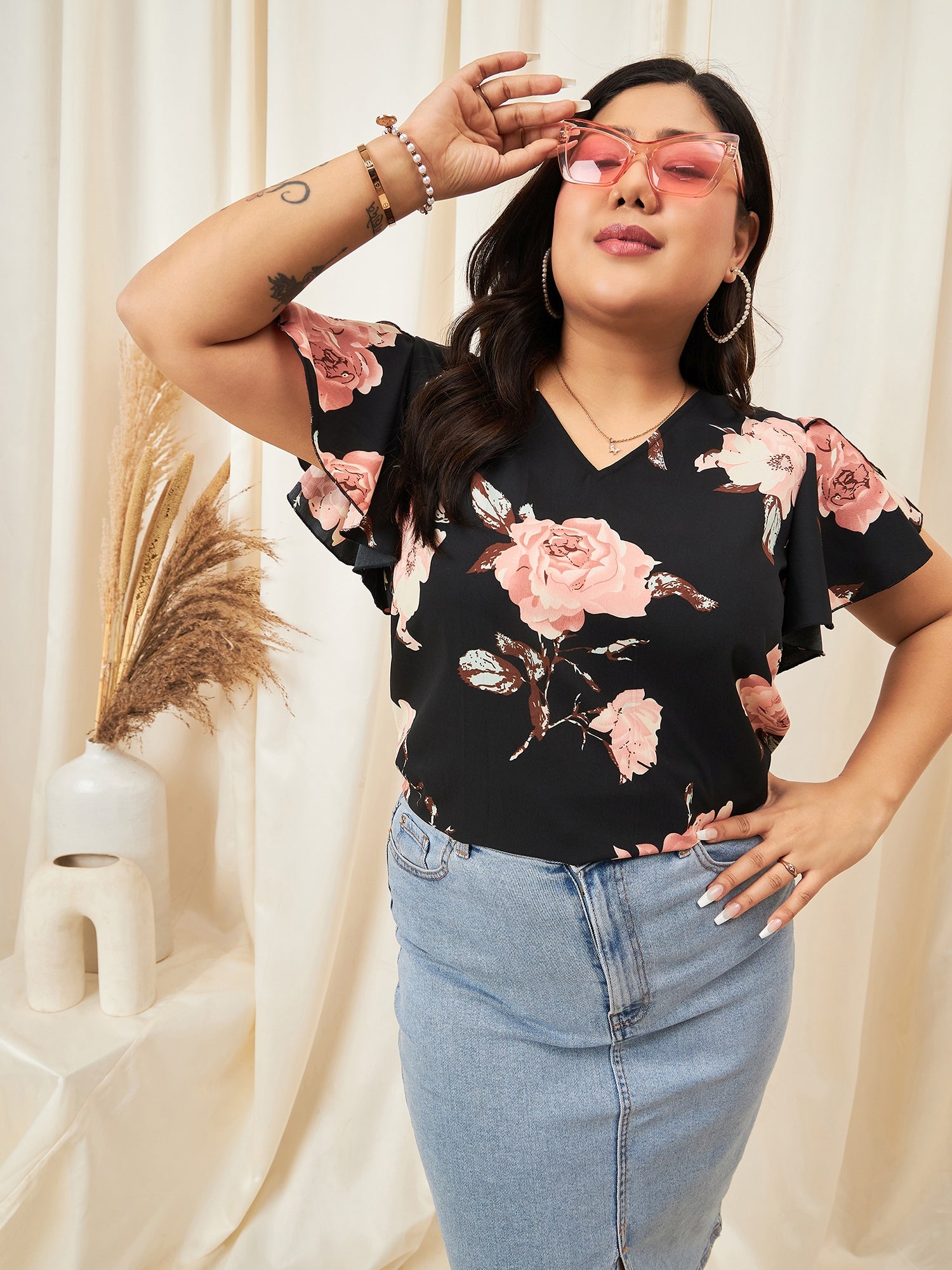 Introducing the Berrylush Curve Black & Pink Floral Printed V-Neck Top, where comfort meets chic sophistication. Perfect for any casual outing, this top features a vibrant floral print in pink and black that's sure to turn heads. Crafted with lightweight polyester fabric, it ensures breathability and ease throughout the day. The elegant V-neck and flutter sleeves add a touch of femininity to your look while providing a flattering fit. Its slip-on design guarantees effortless wearability without compromising on style. Embrace your flair for fashion with this versatile woven garment that promises both comfort and timeless appeal.