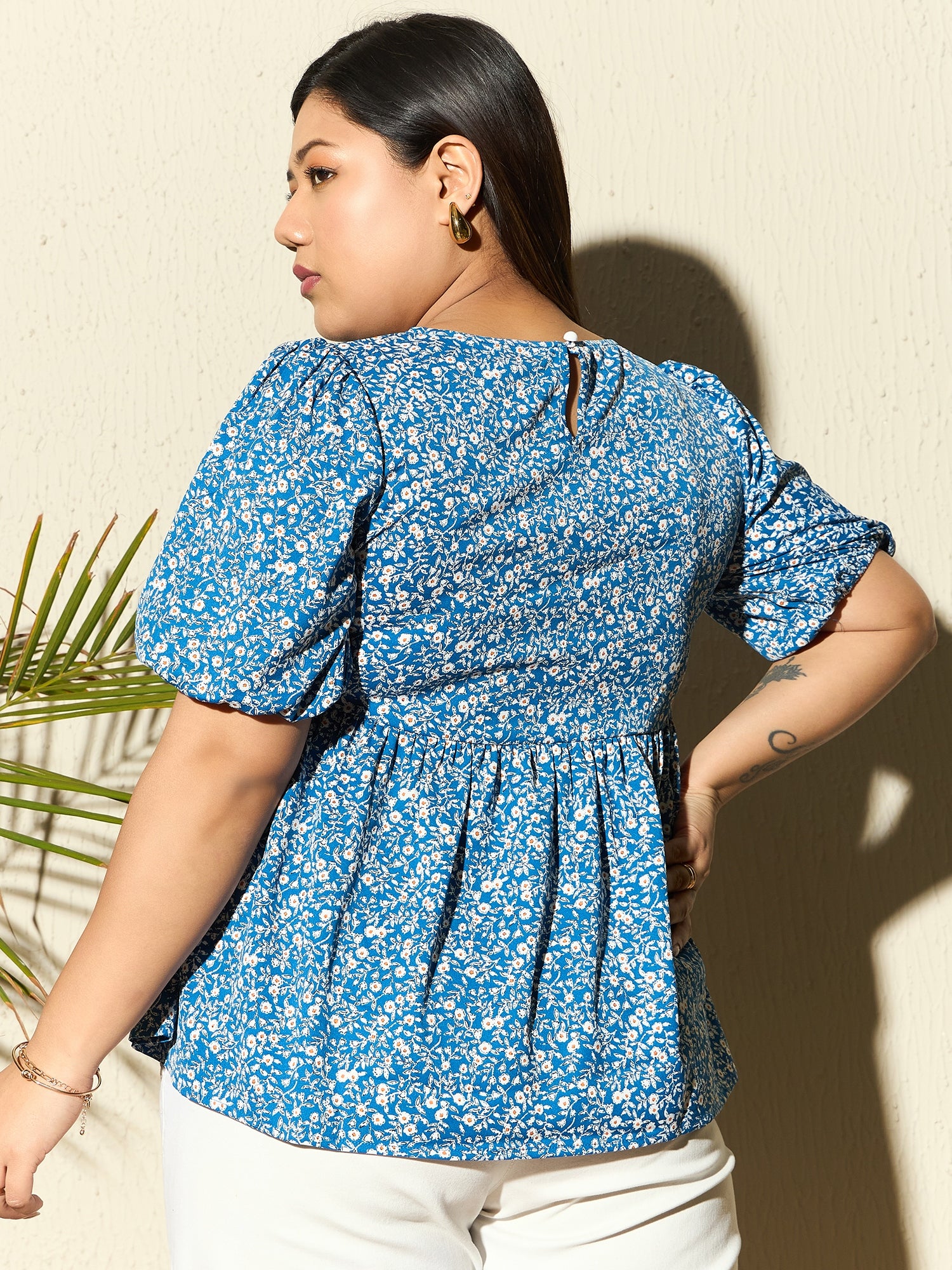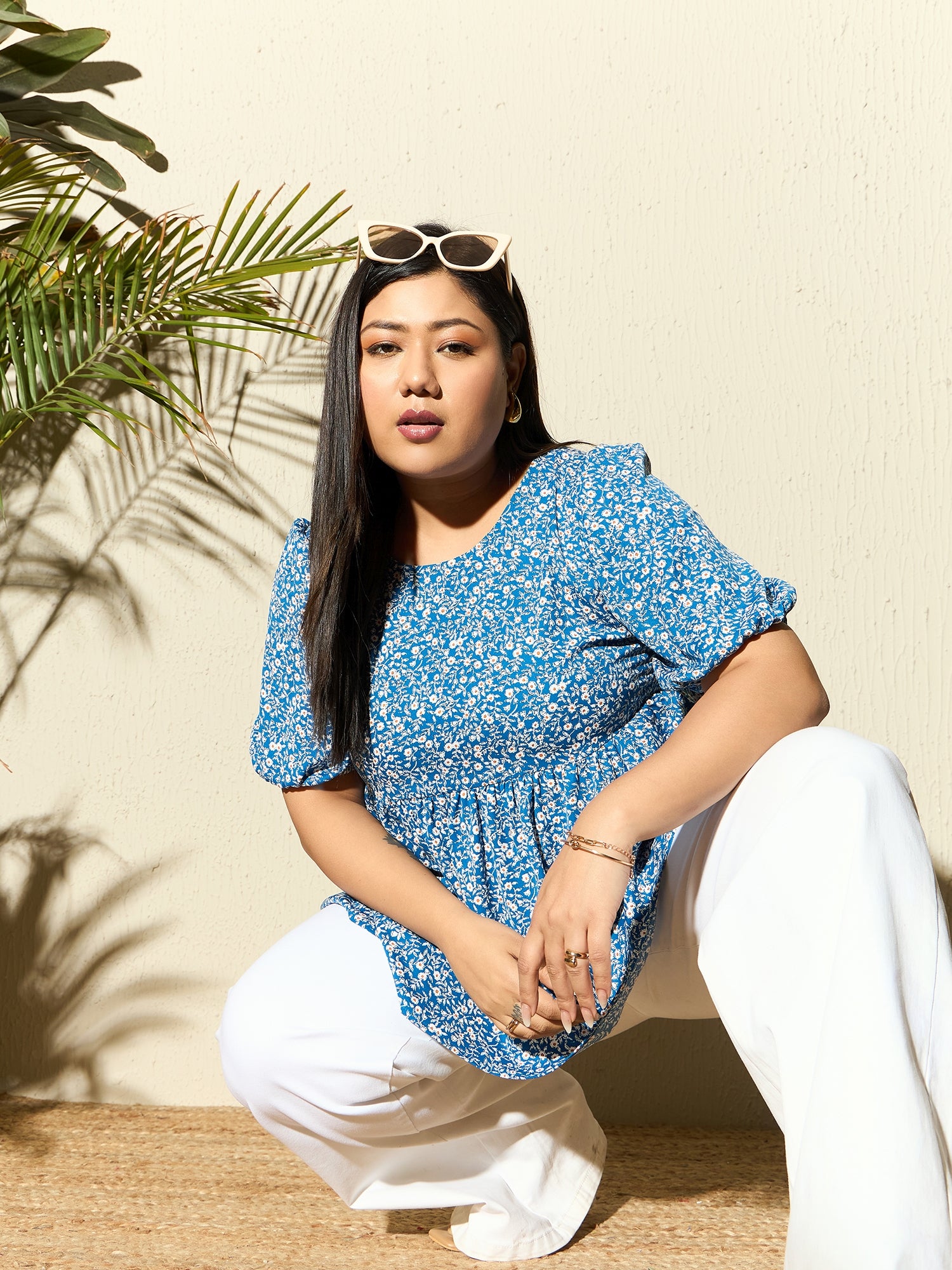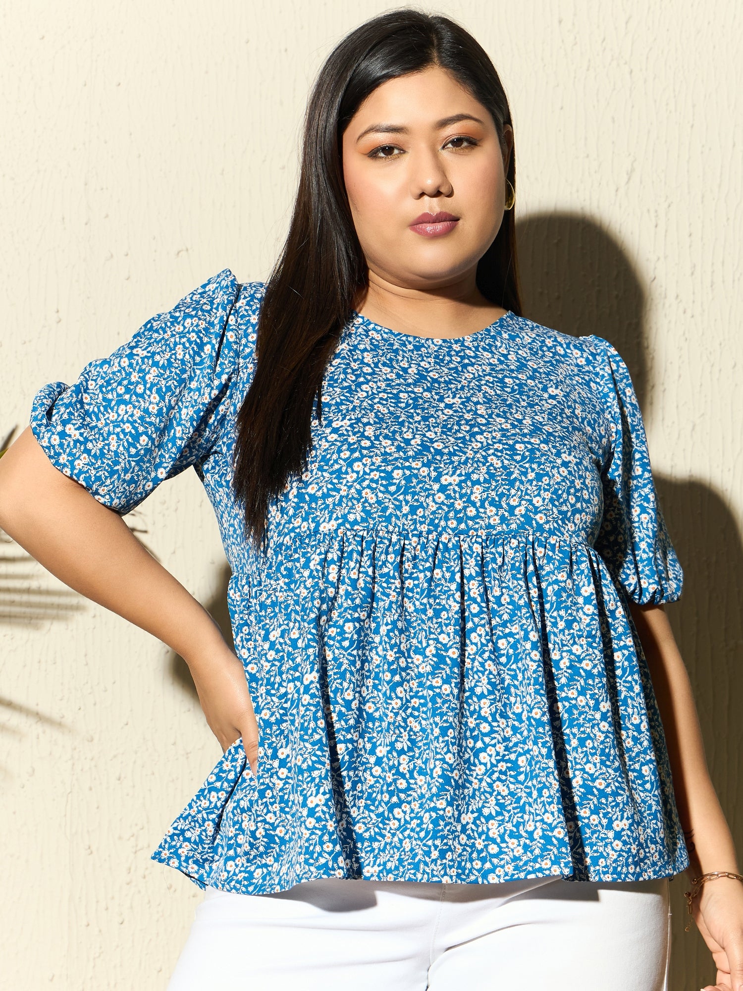 Berrylush Curve Women Blue & White Floral Printed Round Neck Back Keyhole Pleated Regular Peplum Top