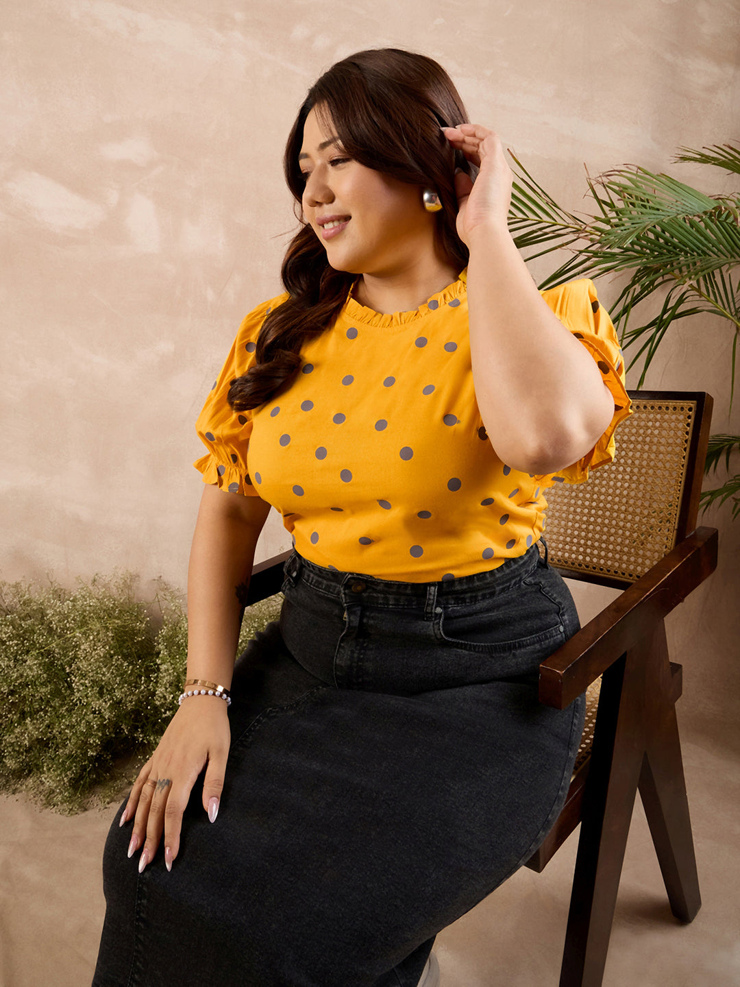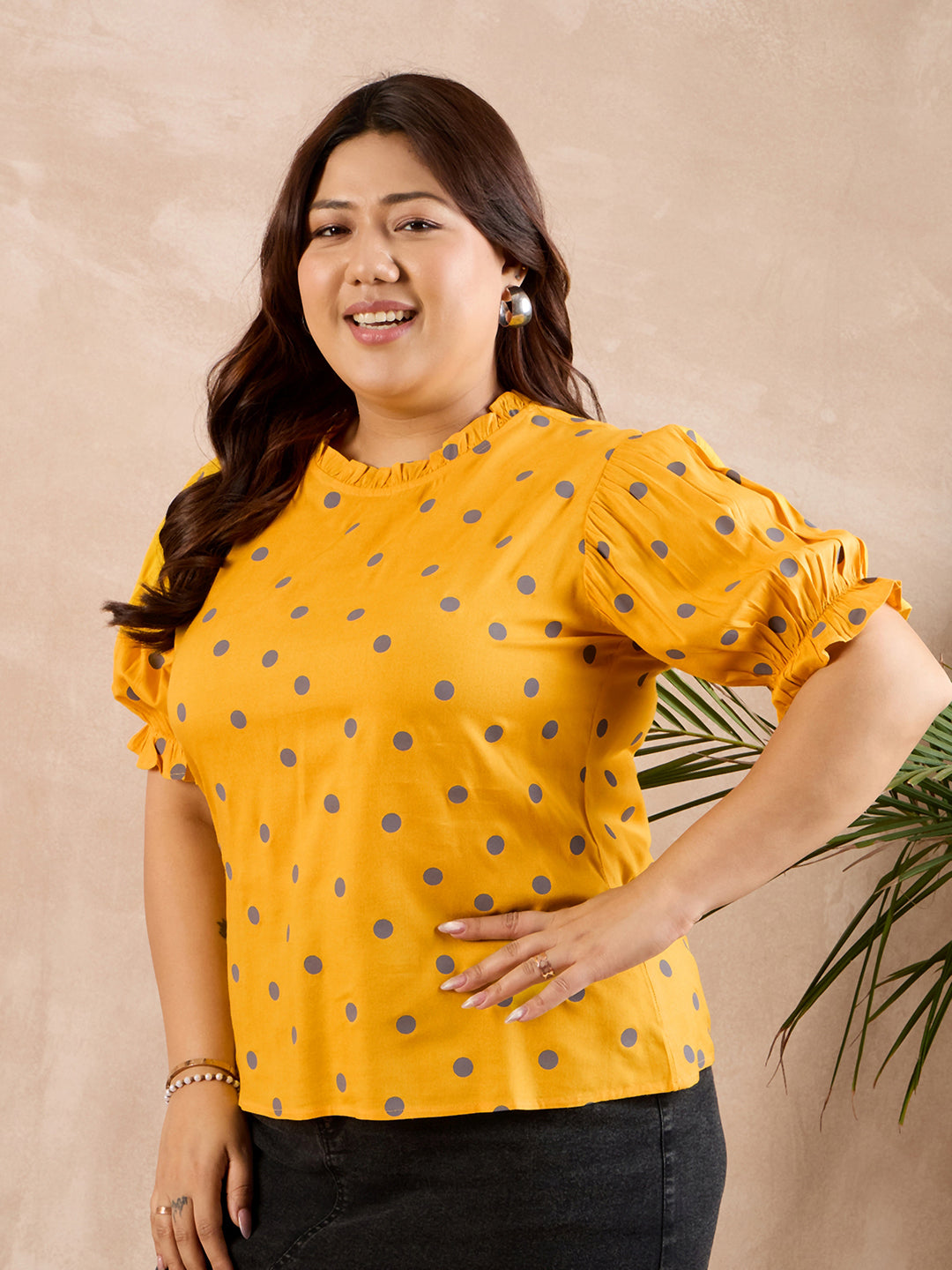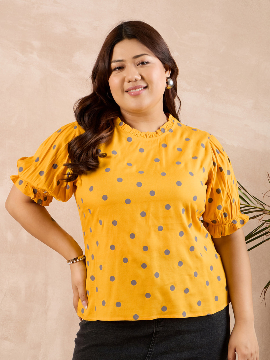 Berrylush Curve Women Yellow & Grey Polka Dot Printed High-Neck Puff Sleeves Cotton Back Keyhole Straight Hem Regular Top