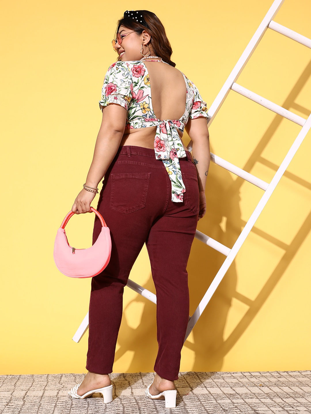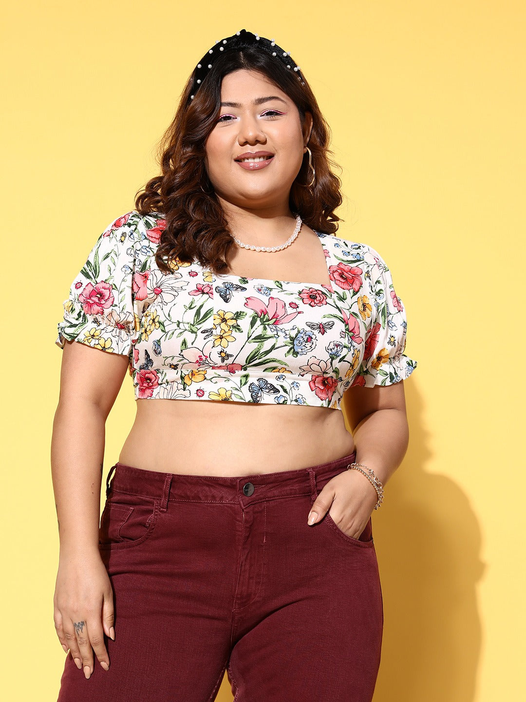 Berrylush Women Plus Size White & Red Floral Printed Square Neck Tie-Up Backless Fitted Crop Top