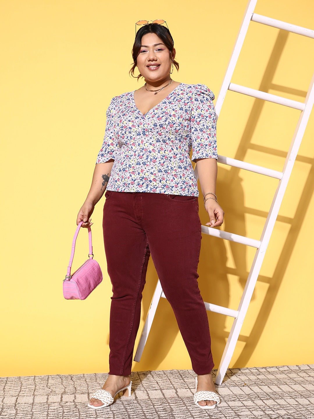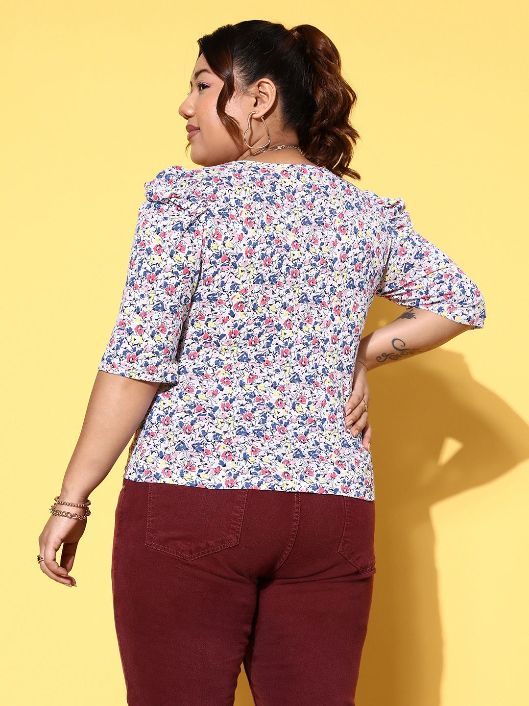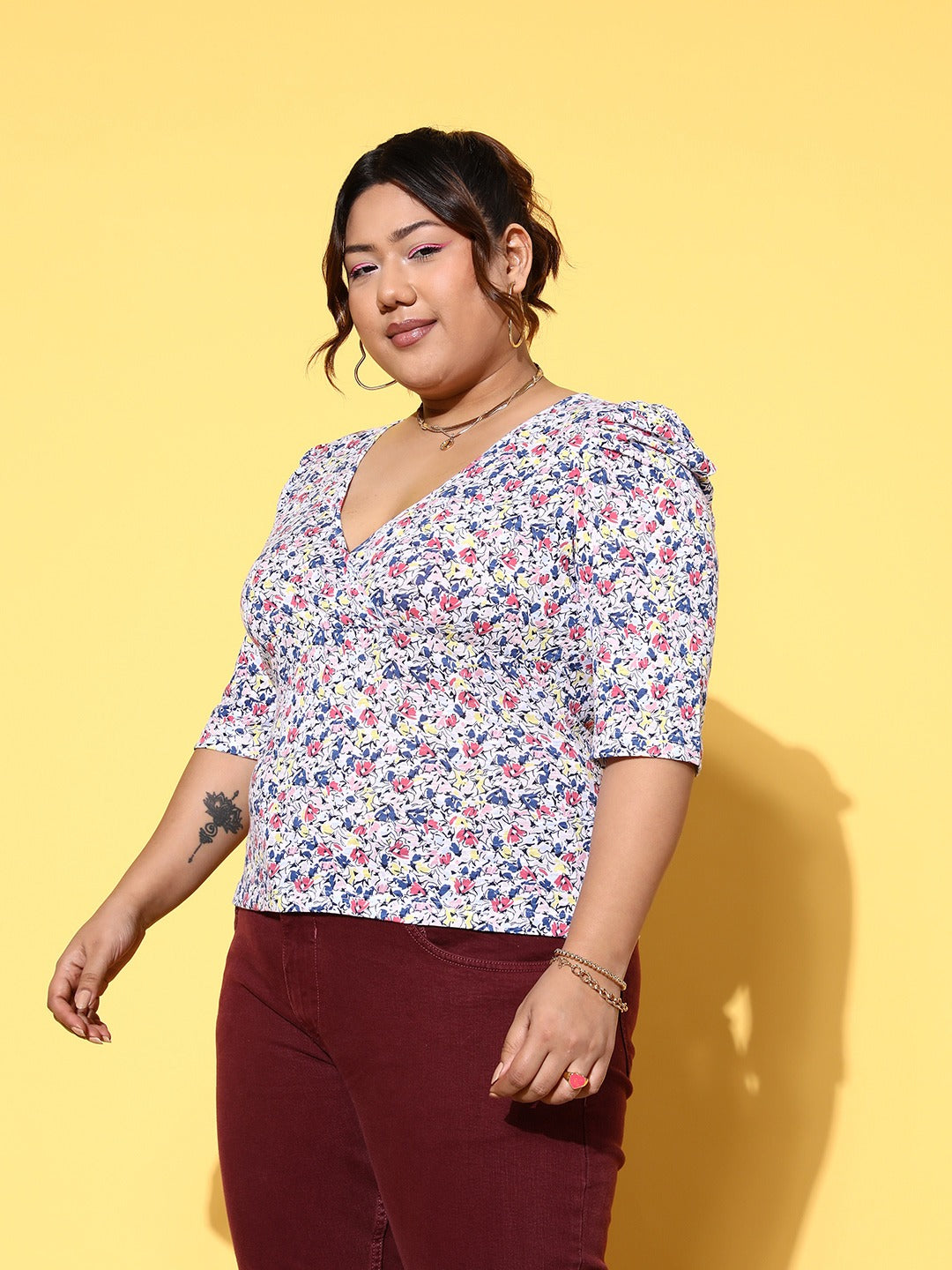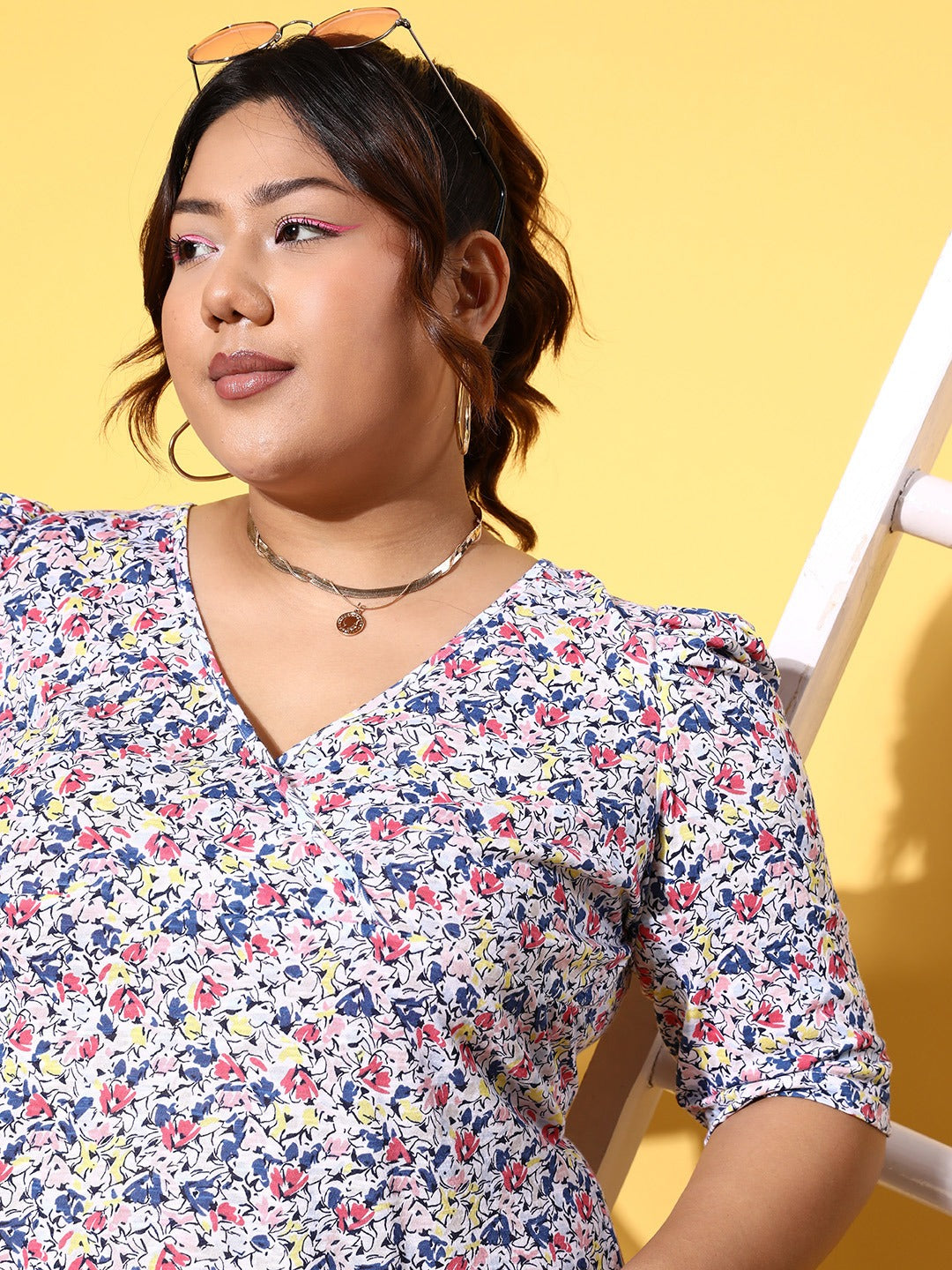 Berrylush Women Plus Size Off-White & Pink Floral Printed V-Neck Puff Sleeves Regular T-Shirt