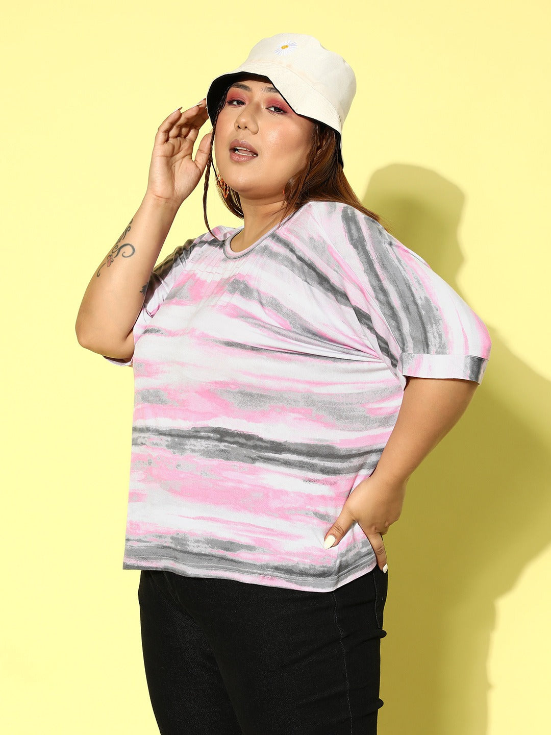Berrylush Women Plus Size White, Black, & Pink Tie-Dye Printed Round Neck Cotton Back Cutout Knitted Regular T-Shirt