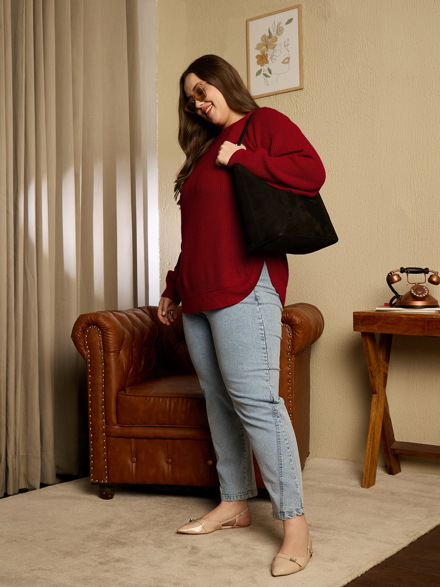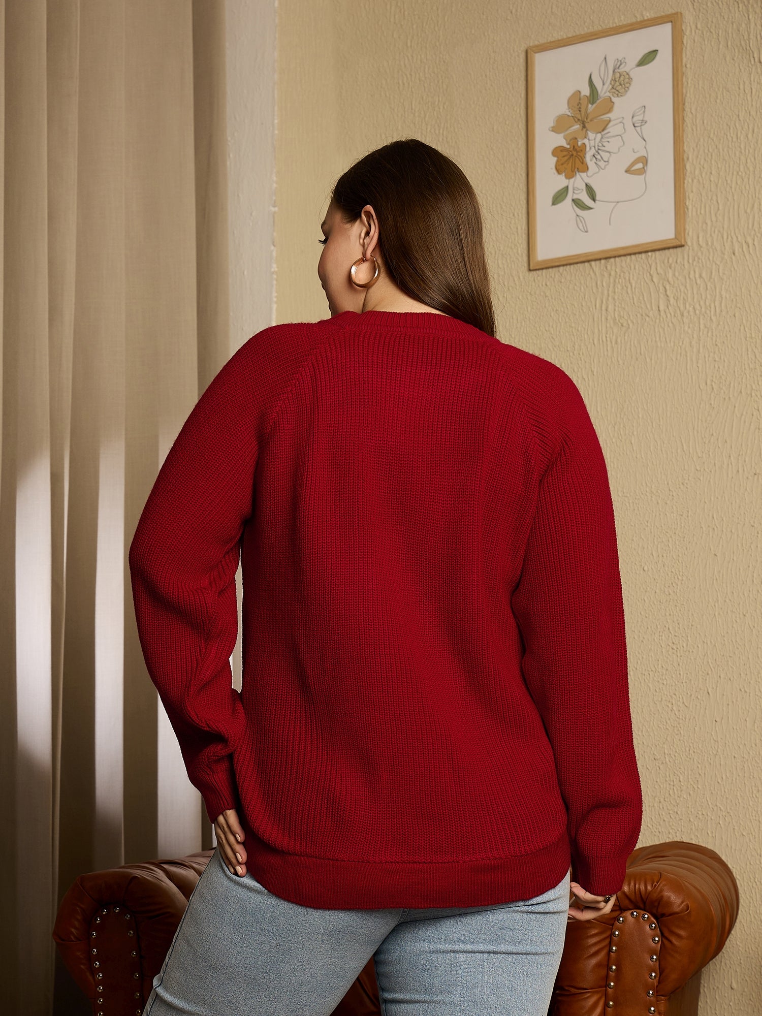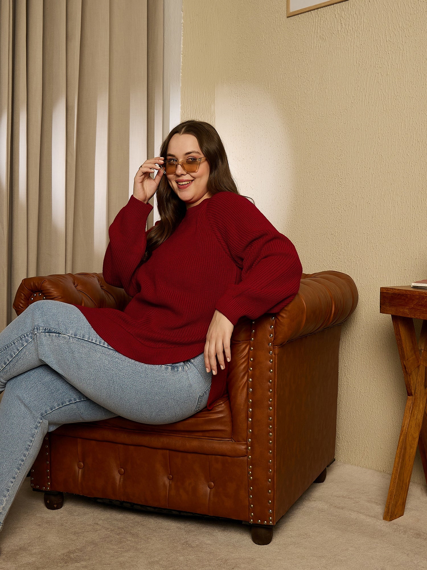 Berrylush Curve Women Solid Red Round Neck Raglan Sleeves Acrylic Curved Hem Longline Pullover