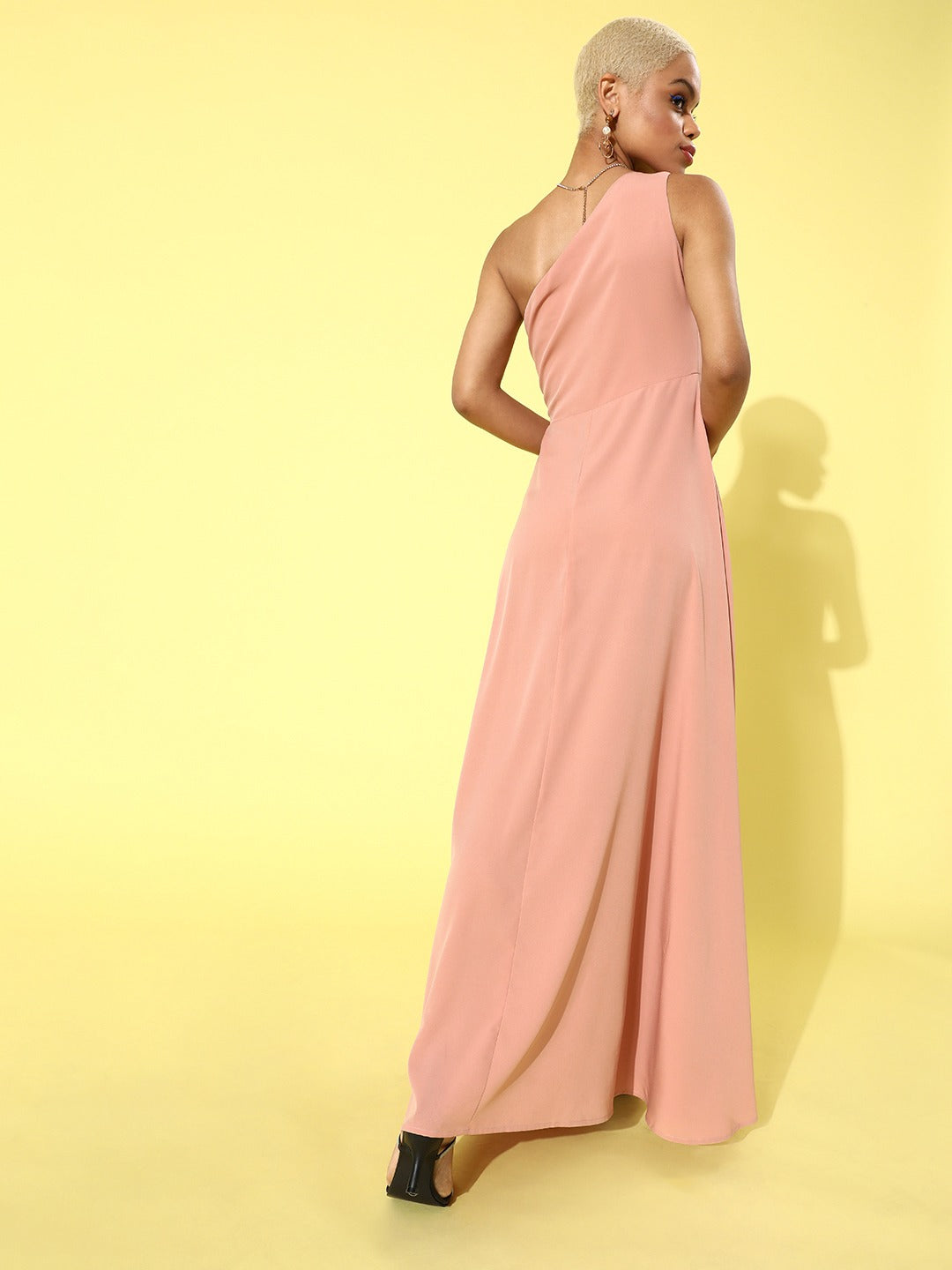 Berrylush Women Solid Pink One-Shoulder Thigh-Slit Flared Maxi Dress