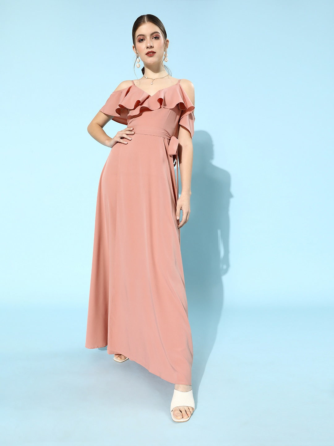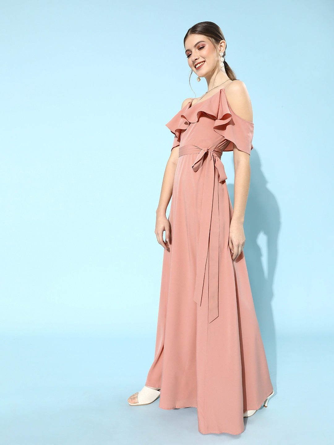 Berrylush Women Solid Pink Cold Shoulder Ruffled Maxi Dress