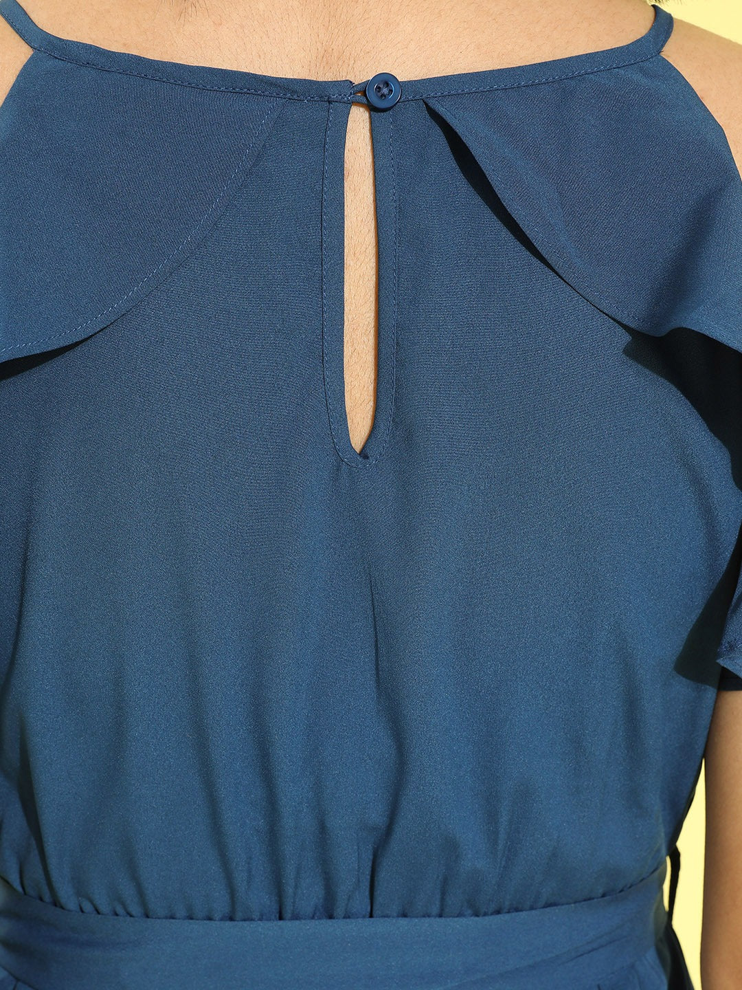 Refine your summer casual wardrobe with contemporary style by adding this bedazzling Solid Blue Round Neck Waist Tie-Up Ruffled Fit & Flare Midi Dress introduced by Berrylush. This midi dress is elegantly designed with a blue solid pattern that depicts your calming personality and a vigorous appeal. Beautifully crafted from crepe polyester fabric to add amazing drape and wrinkle resistance. Button closure lets you easily remove and wear this dress. To create a gracious and comfy look, you can also wear this charming midi dress with a pair of strappy heels and a sling bag.
