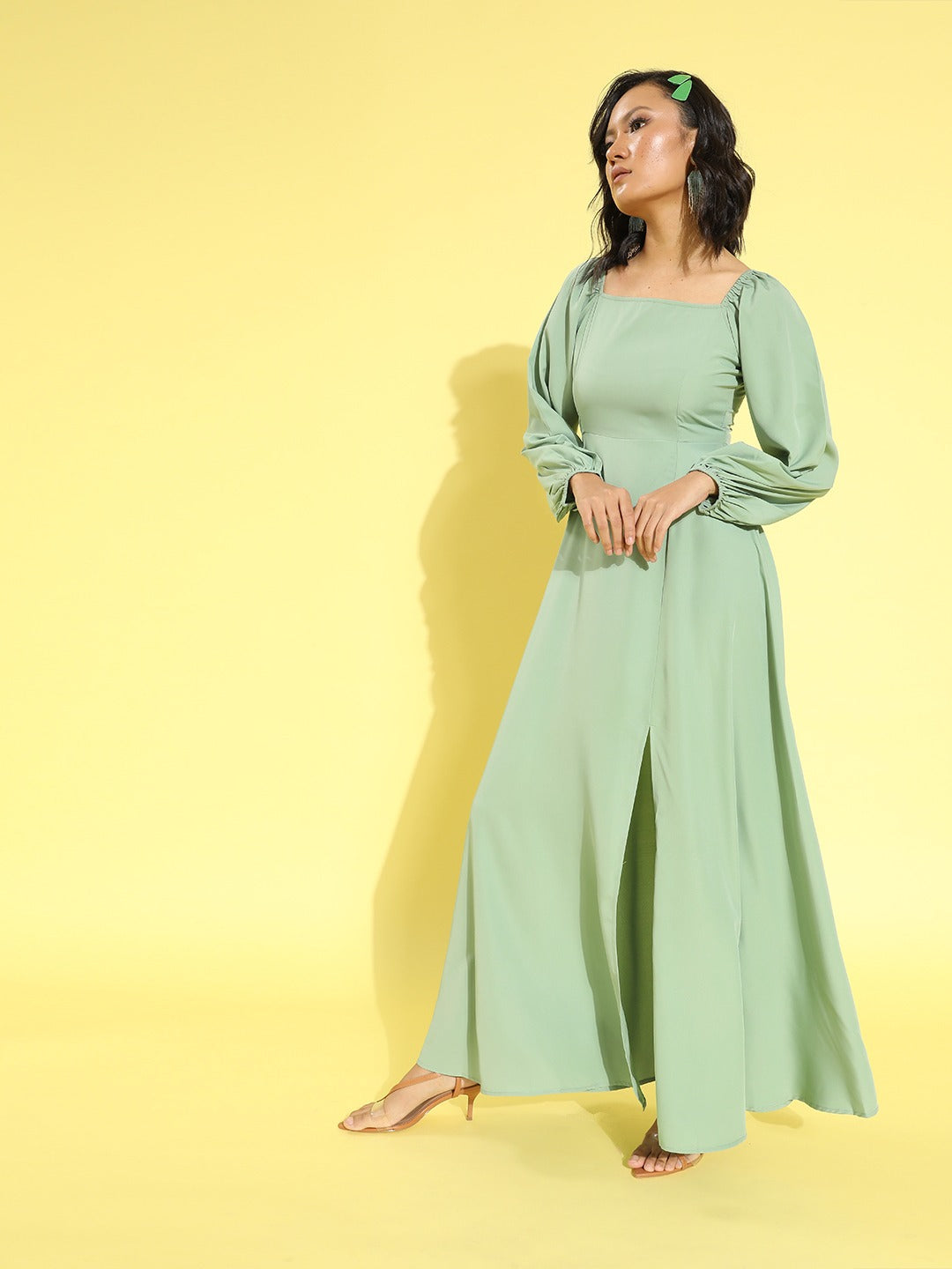 Evoke a feeling of refreshment by injecting the dominance of green shade within your casual wardrobe with this gorgeous Solid Green Square Neck Puff Sleeves Crepe Flared Maxi Dress designed by Berrylush. The beautiful duo of green shade with solid pattern expresses the nature of life and renewal with a sophisticated texture. The square neck design and long puffed sleeves create a fashionable appearance by giving a vigorous highlight to your neckline and arms. Rendered from crepe polyester fabric to provide a luxurious formula of keeping this maxi dress lightweight along with a smart appearance. Team up this spectacular maxi dress with a pair of caged heels and a side bag to create a fashionable appearance.