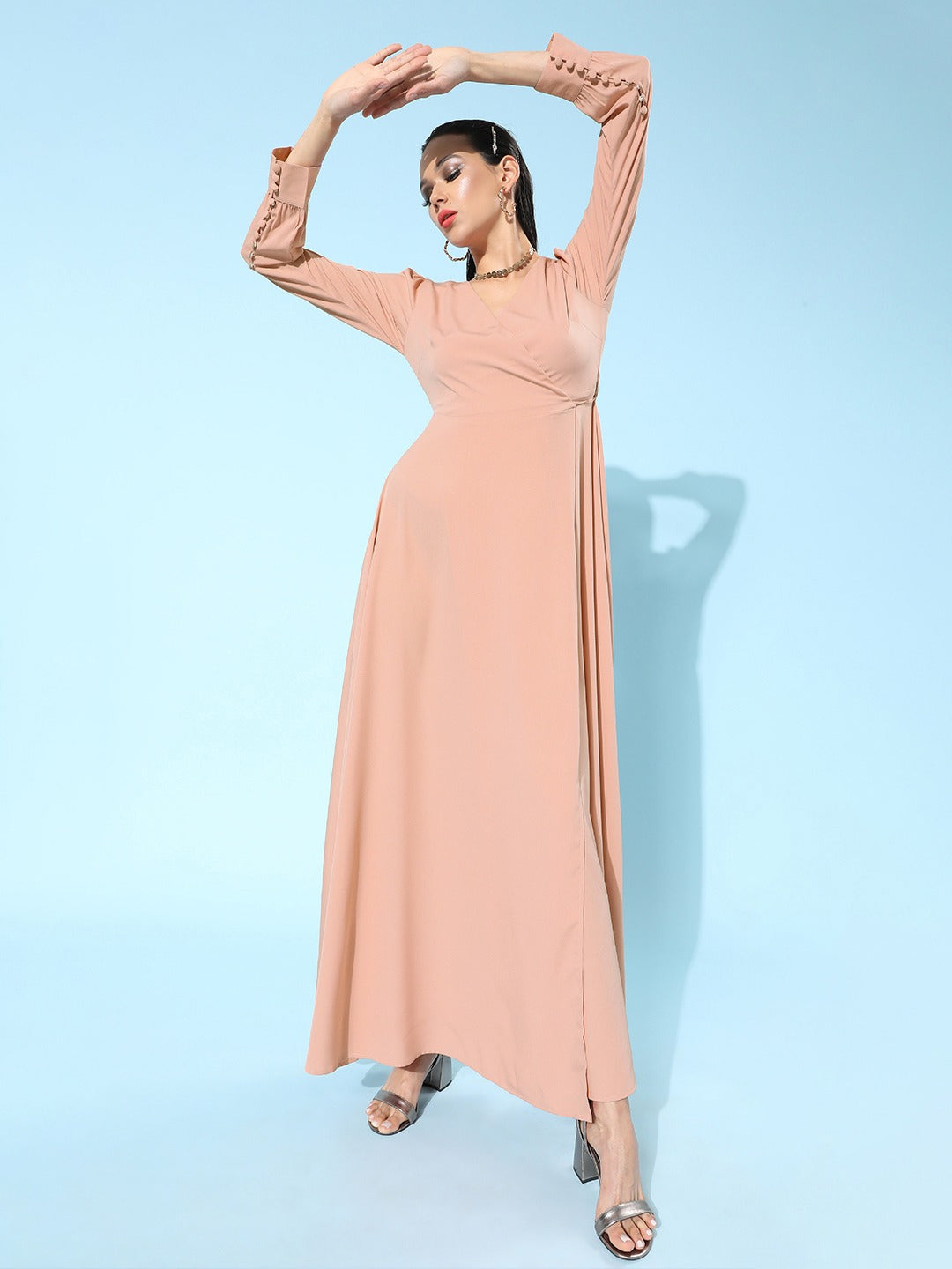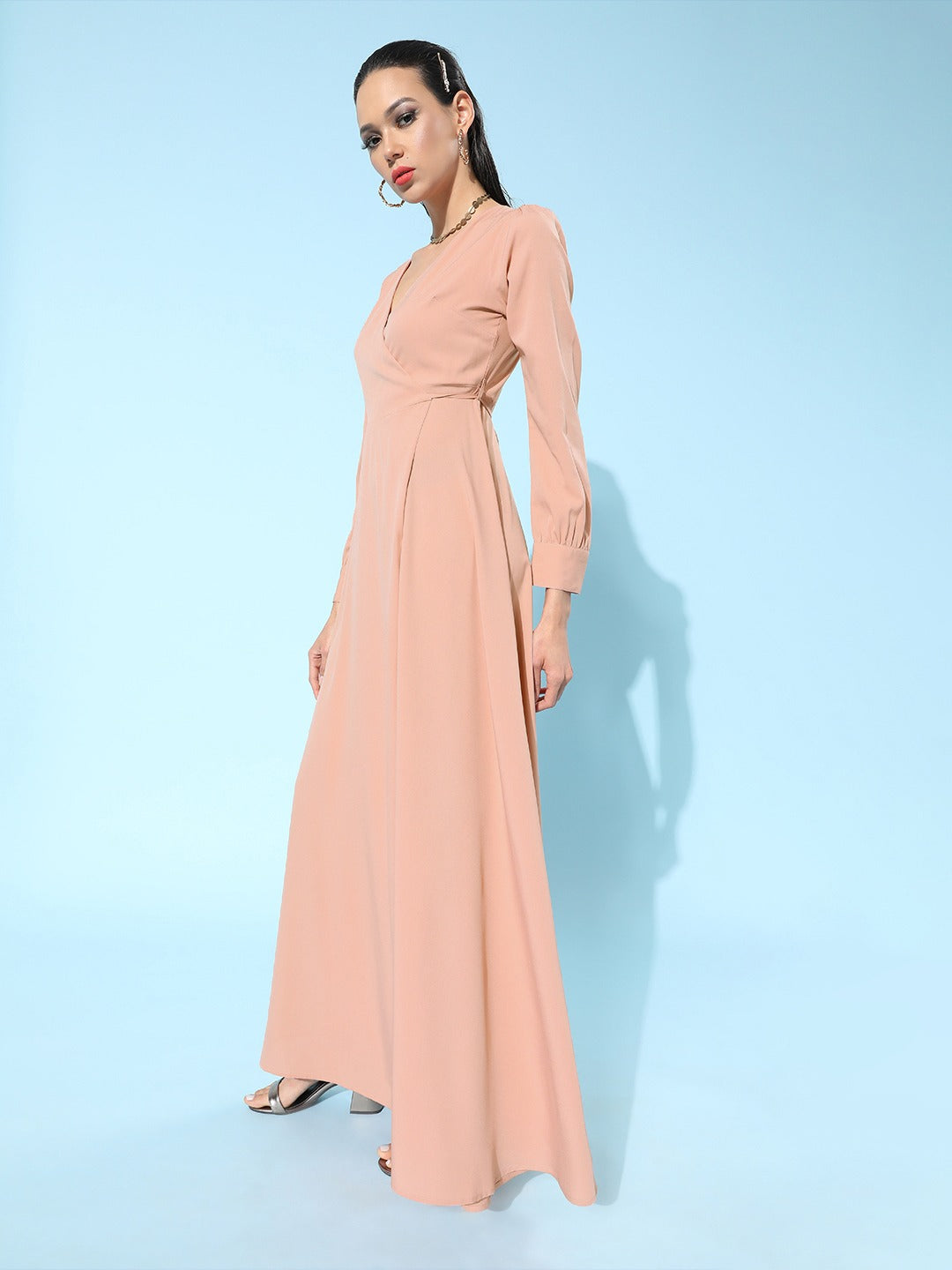 If you love a simple yet stylish outfit, then this pretty Solid Pink V-Neck Waist Tie-Up Thigh-High Slit Flared Maxi Dress from Berrylush is made for you. Compromising of pink shade and solid pattern which assembles a feminine and sophisticated look. Wrap styling along with flared hemline lends a firm fit at the waistline. Crafted from super soft and breathable crepe polyester fabric to provide comfortable texture to your body. The pleated surface styling of this maxi dress adds a charismatic and gleaming sheen. To create an astonishing look you can pair up this elegant maxi dress with a pair of block heels and a side bag.