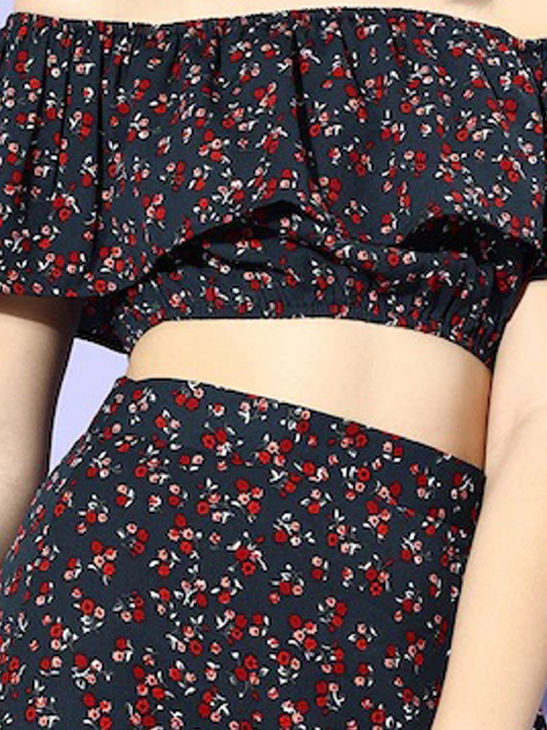 Berrylush Women Navy Blue Floral Off-Shoulder Co-Ordinate Maxi Dress