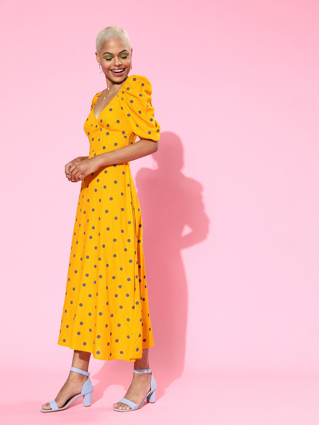 It's time to fulfill your fantasy about periodical style with some sizzling and chic texture by treating yourself to this enticing Yellow & Black Polka Dot Printed Sweetheart Neck Flared A-Line Maxi Dress from Berrylush. Spun from viscose rayon fabric to keep this maxi dress super-lightweight along with high moisture-wicking properties. Apart from this feature, this maxi dress is designed with an elegant sweetheart neck to lend a striking outshine to your neckline while the short puff sleeves give a vintage sheen to your arms. Complete your sophisticated look by pairing up this majestic A-line maxi dress with strappy heels and your favorite handbag.