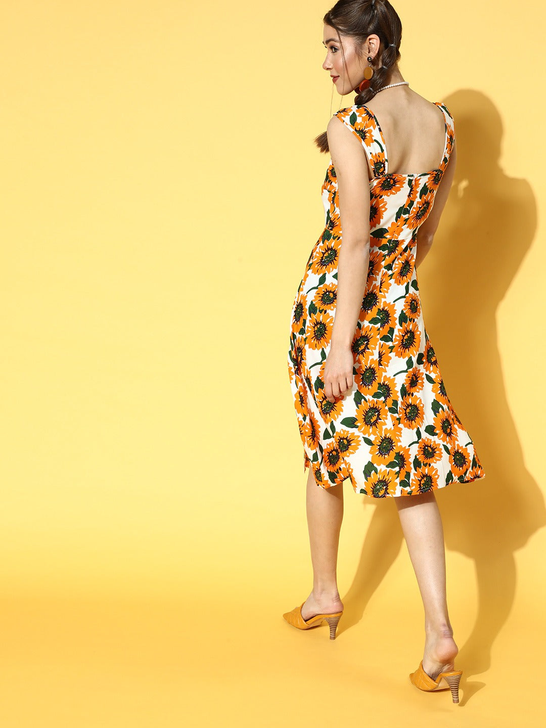 Berrylush Women White & Mustard Yellow Sunflower Printed Sweetheart Neck Thigh-High Slit Pleated A-Line Midi Dress