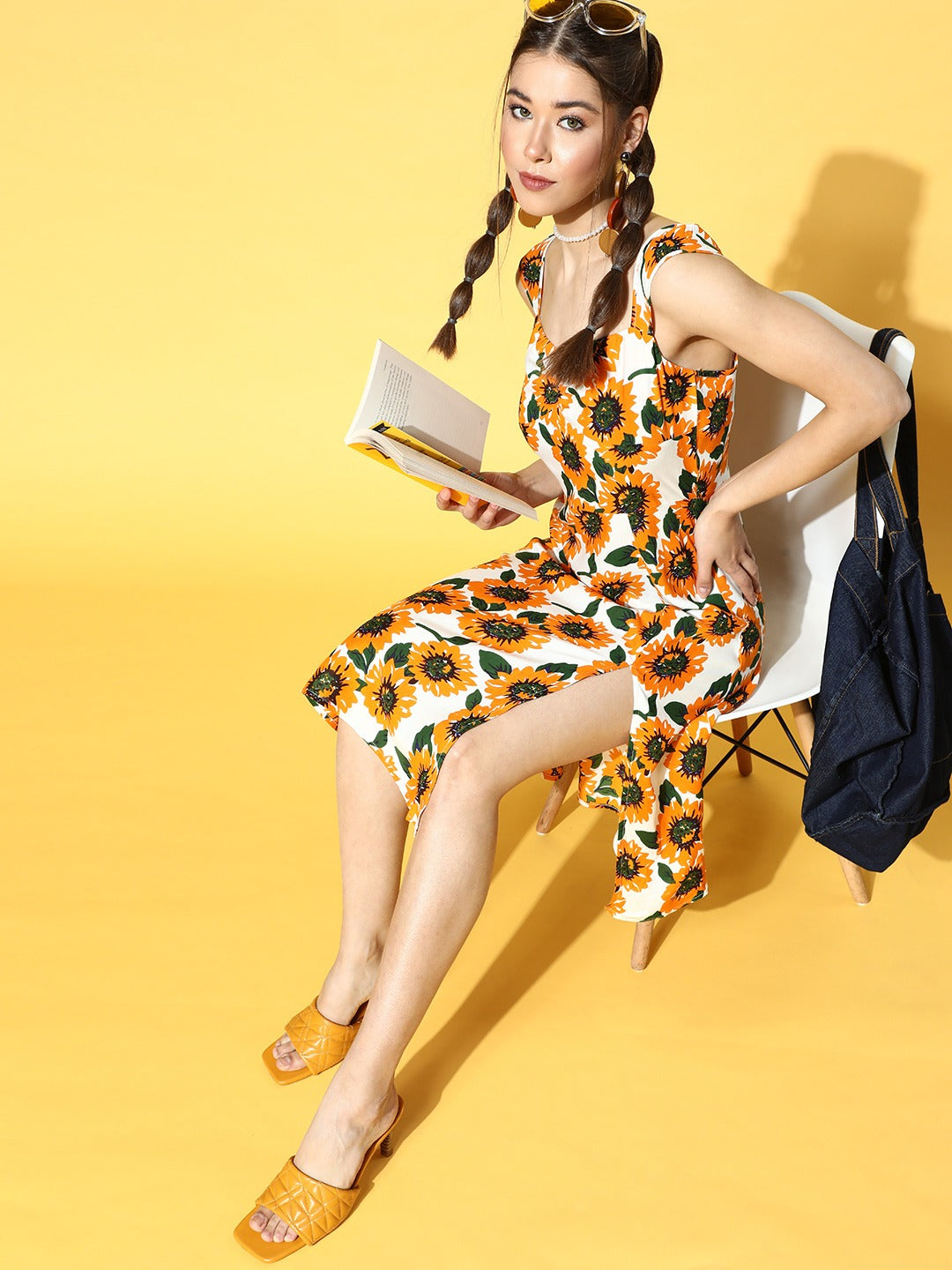 Get summer ready with the style that catches the light and showers by wearing this dazzling White & Mustard Yellow Sunflower Printed Sweetheart Neck Thigh-High Slit Pleated A-Line Midi Dress from Berrylush. Flaunting a charming duo of white shade and mustard yellow sunflower print that renders a charming modern touch to this dress. Styled in an A-line shape that provides a form-fitting from your shoulders to your waist area further accompanied by a flattering structure. Designed with side slit detailing to give a sexy and enchanting appeal to your beautiful legs along with limitless comfort. Create a gorgeous look by partnering up this midi dress with a pair of pump heels, cute floral earrings, and a beige tote bag.