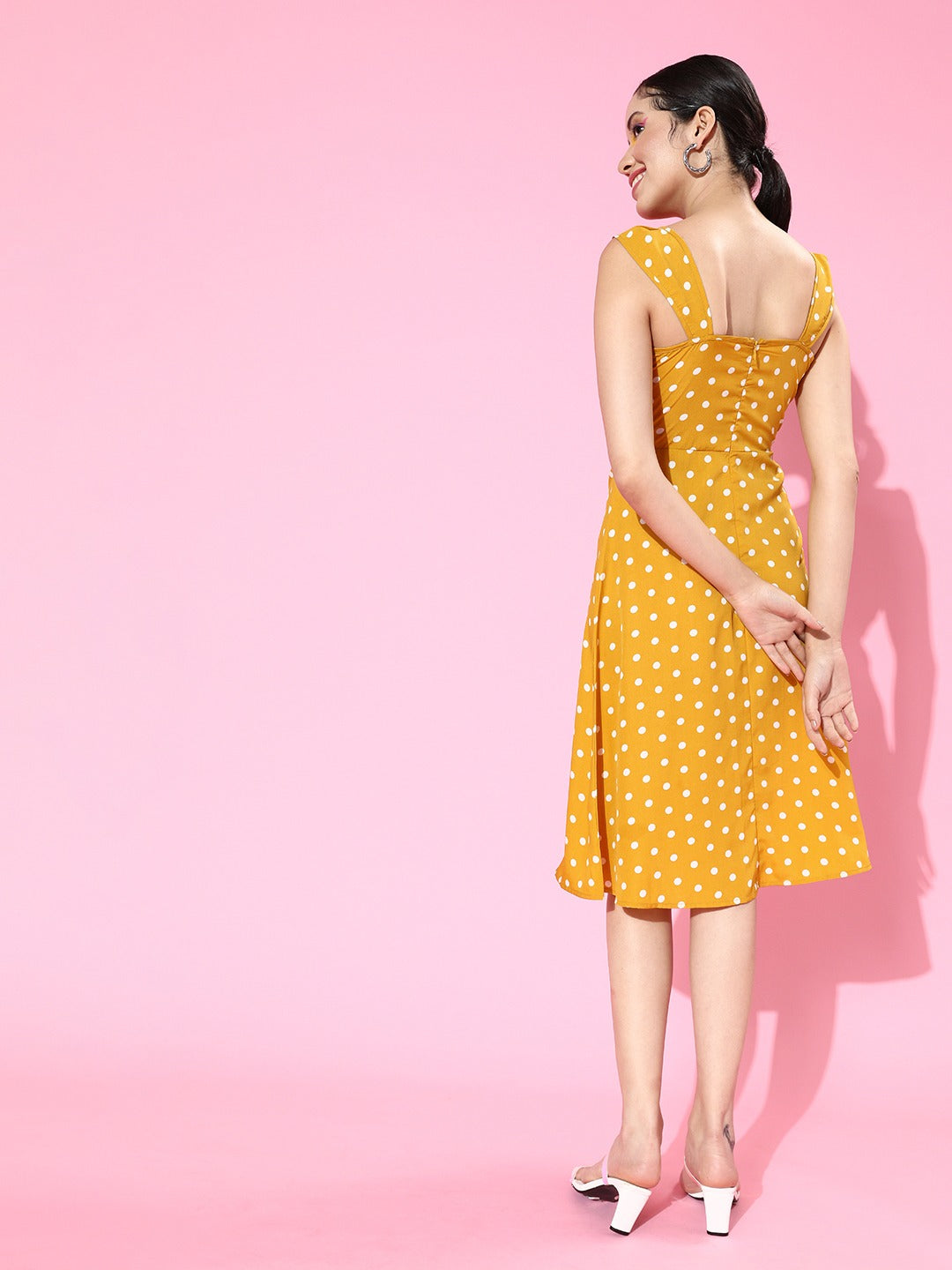 Berrylush Women Yellow Polka Dot Printed Sweetheart Neck Flared A-Line Midi Dress