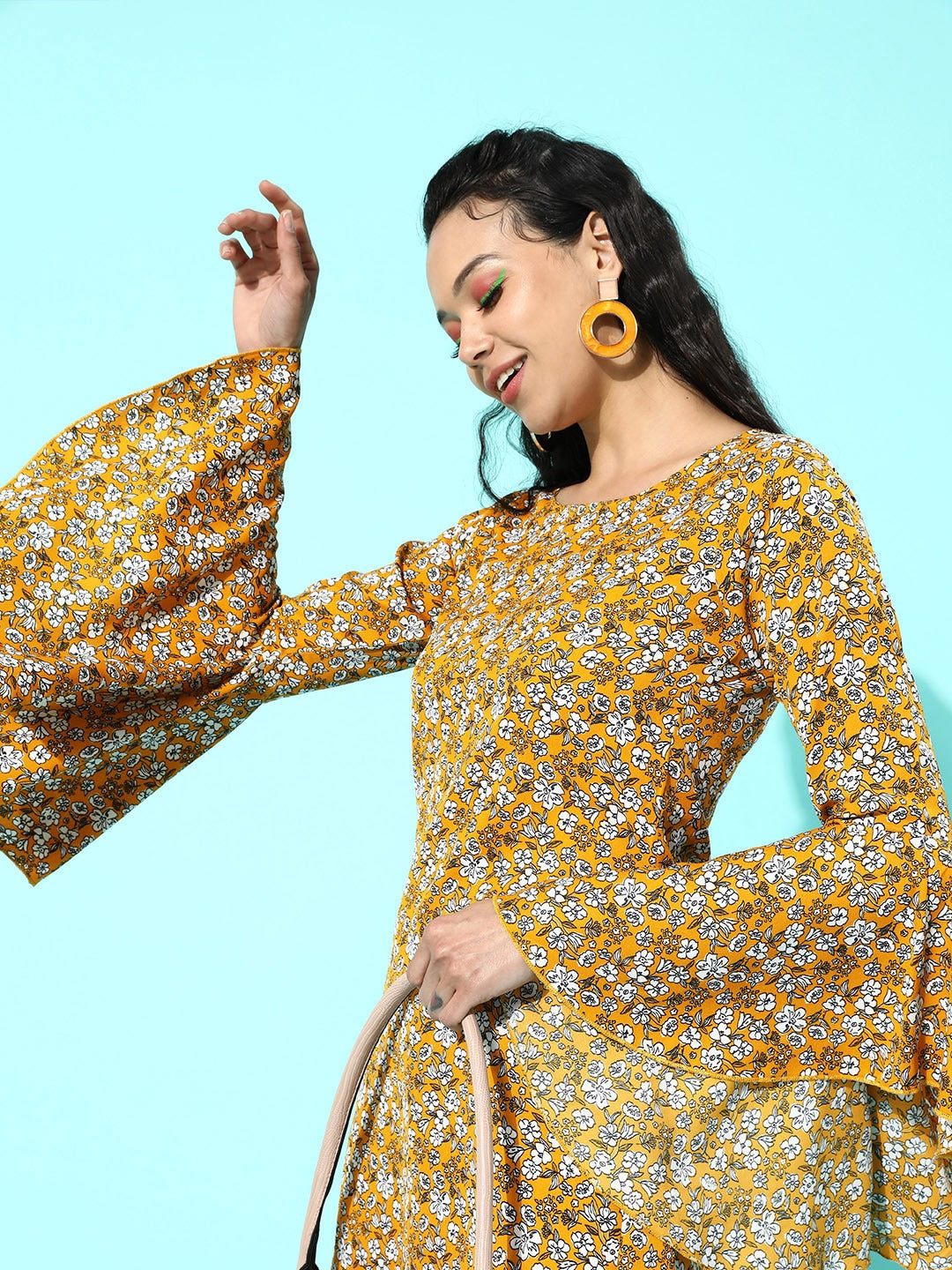 This spring season builds up your casual wardrobe with joyful and vibrant vibes with this magnetizing Mustard Yellow Floral Printed Round-Neck Crepe A-Line Mini Dress from the spring wear collection of Berrylush. The most loved element of this dress is its A-line shape which gets you an hour-glass figure with its curve-defining fit. Prepared from crepe polyester fabric to keep you comfortable along with moisture-absorbing features and the long bell sleeves give an astonishing appeal to your arms along with proper coverage. Round neck design presents a dignified outlook to your neckline and flared hemline adds textures finish to the dress. Partner up this dress with your favourite high-heels, floral earrings, and a trendy handbag to create a captivating casual look.