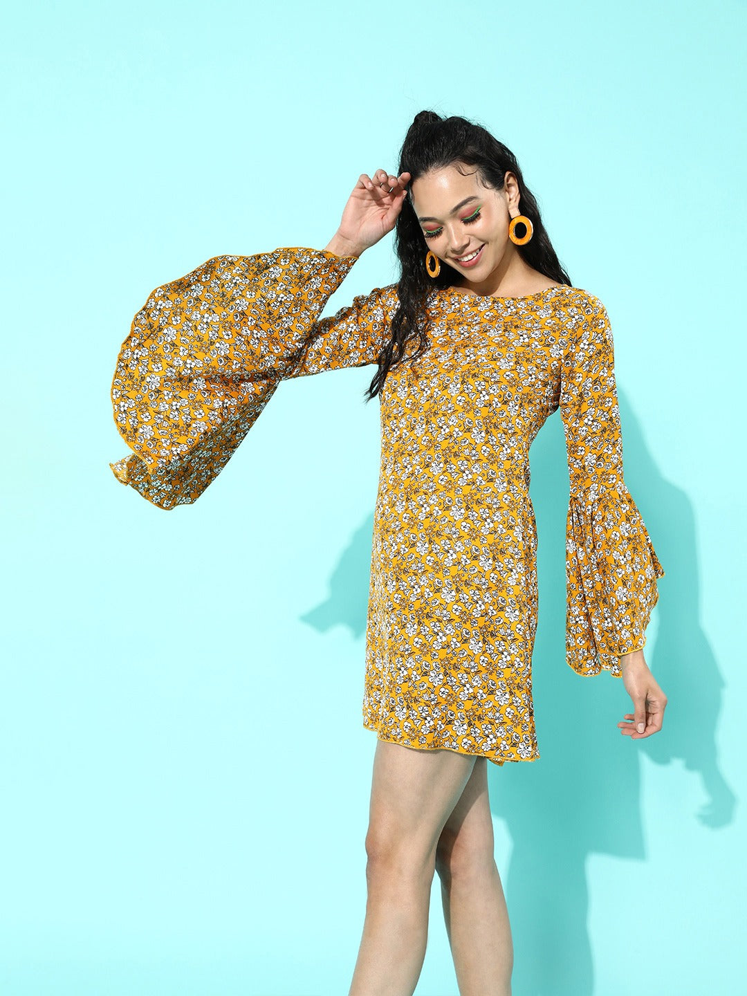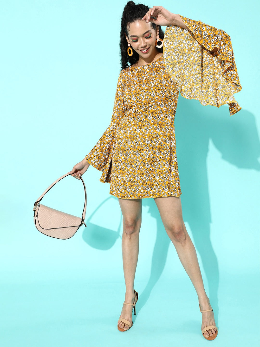 Berrylush Women Mustard Yellow Floral Printed Round-Neck Crepe A-Line Mini Dress