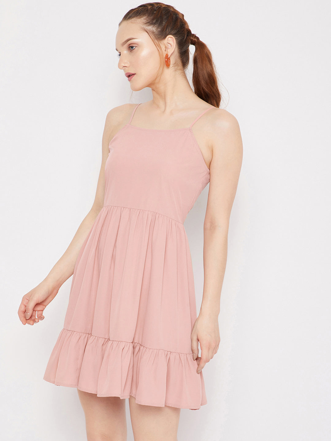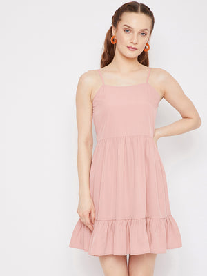 Berrylush Women Solid Pink Square Neck Sleeveless Ruffled A-Line Mini Dress